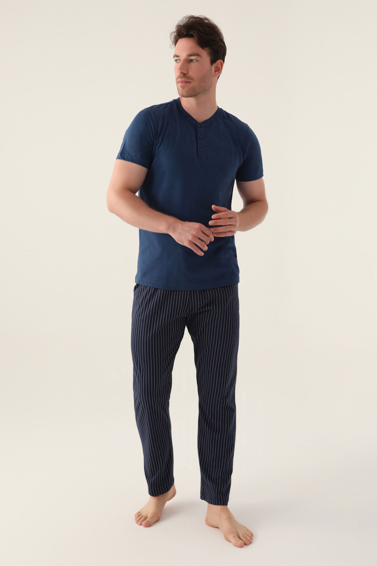 Erkek pijama takımı, kısa kollu ve yaka kısmında üç düğme detayı bulunan bir tasarıma sahiptir. Yaz aylarında kullanım için ideal olan kısa kollu pijama takımı, serin ve rahat bir giyim deneyimi sunar. Üç düğme ile süslenmiş yaka tasarımı, pijamanın üst kısmına modern ve şık bir görünüm kazandırır. Ayrıca düğmeler, kullanıcının giyim tercihine göre yakanın açılıp kapanmasını sağlar. "Süprem" olarak adlandırılan malzeme genellikle pamuk ve polyester karışımından oluşur. Bu tür kumaşlar, rahatlık sağlarken aynı zamanda dayanıklılığı da artırır ve cilde yumuşak bir dokunuş sunar.Çeşitli beden seçenekleri arasında büyük beden seçeneği, daha geniş bir kullanıcı kitlesine hitap etmektedir.Bu tür pijama takımları genellikle evde dinlenme zamanlarında veya uyku için kullanılır. Kısa kollu ve hafif yapılarıyla özellikle yaz aylarında ideal bir seçimdir. Ayrıca pijama takımının şık tasarımı, kullanıcıya hem konfor hem de estetik sunar. Erkek pijama takımları genellikle kaliteli malzeme ve detaylı tasarımıyla bilinir. Bu tarz bir pijama takımı, hem evde dinlenme zamanlarında hem de uyku için kullanılabilecek şekilde tasarlanmıştır