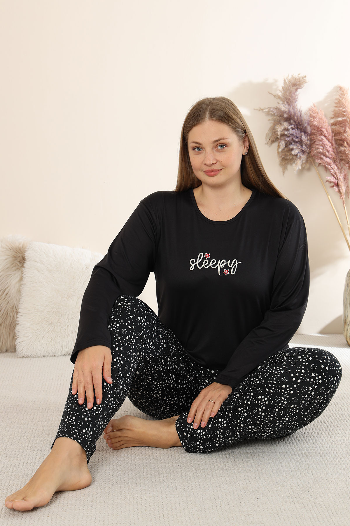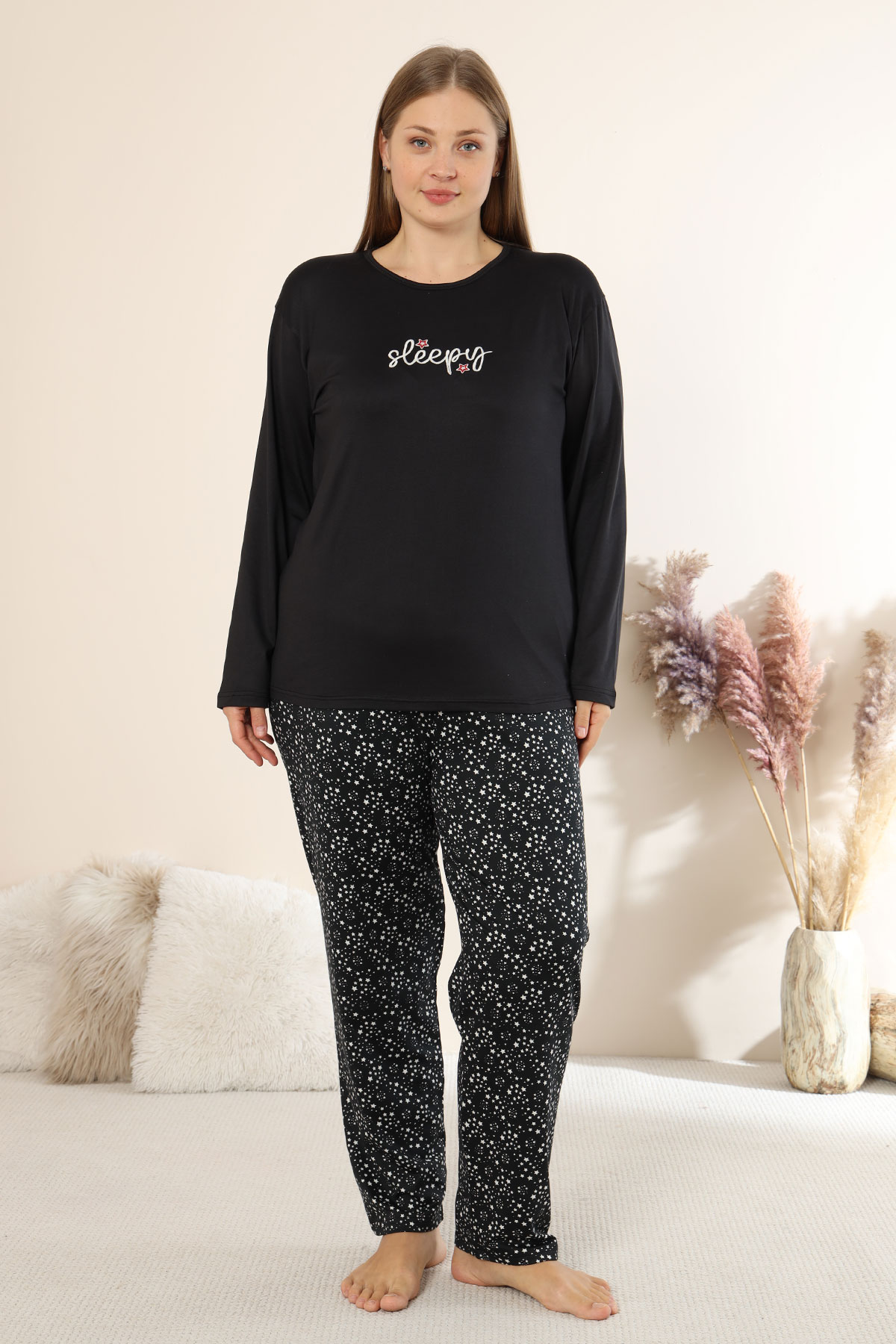 Boyraz Kadın Pijama Takımı Uzun Kollu Büyük Beden Bisiklet Yaka Kalp Desenli Sendy - Siyah