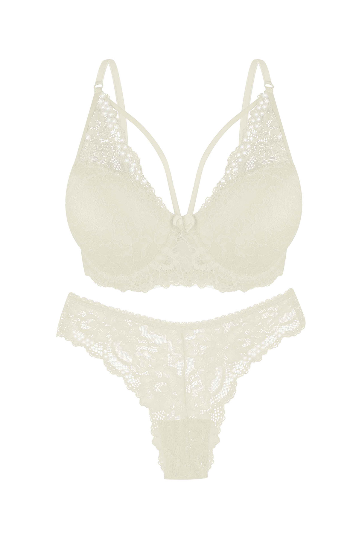 Dominant Kadın Sütyen Külot Takım Destekli İpli Taşlı - Ekru