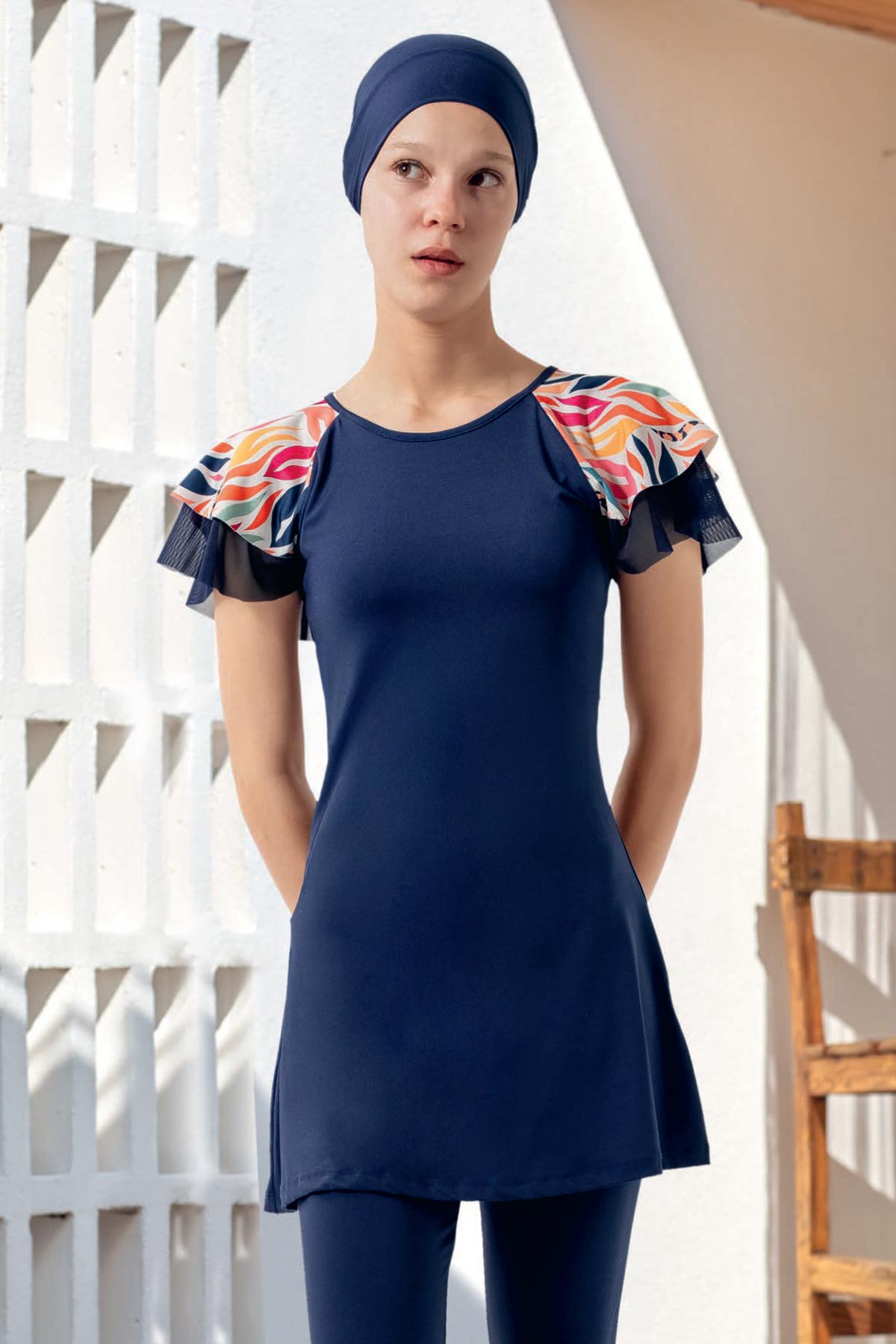 Maresiva Kız Dora Garson Yarı Kapalı Tesettür Mayo Omuz Fırfır Detaylı - Koyu Lacivert