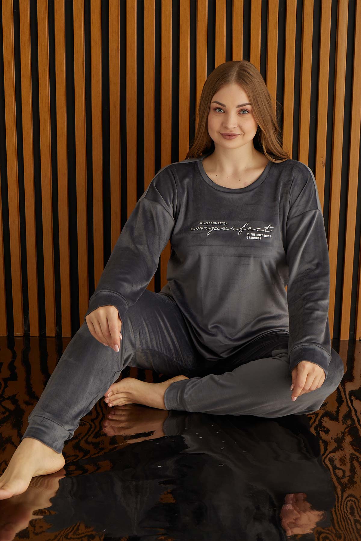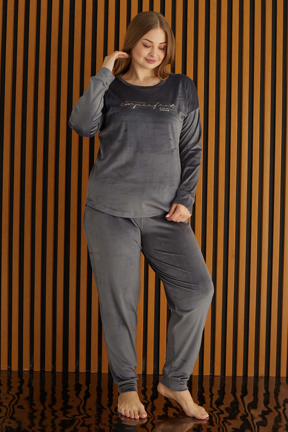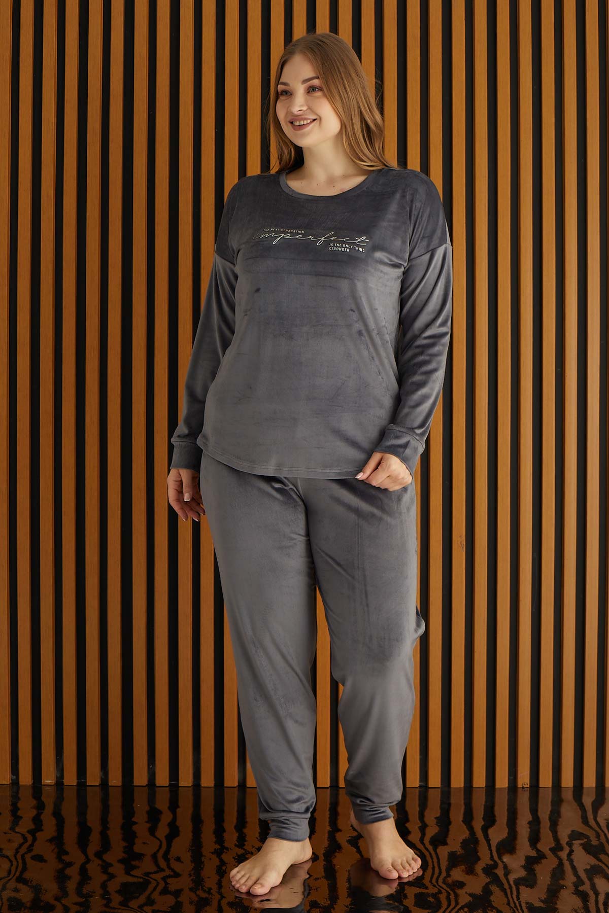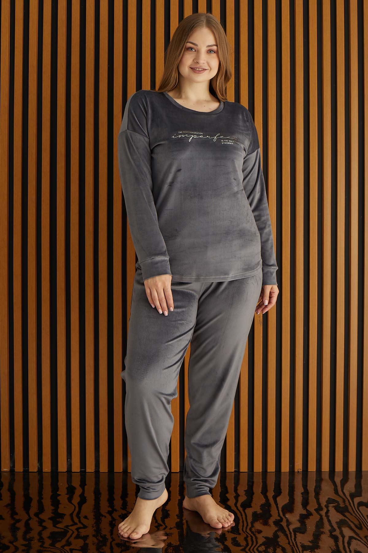 Pijamoni Kadın Büyük Beden Pijama Takımı Uzun Kollu Kadife Paça Manşetli Önü Yazılı - Gri