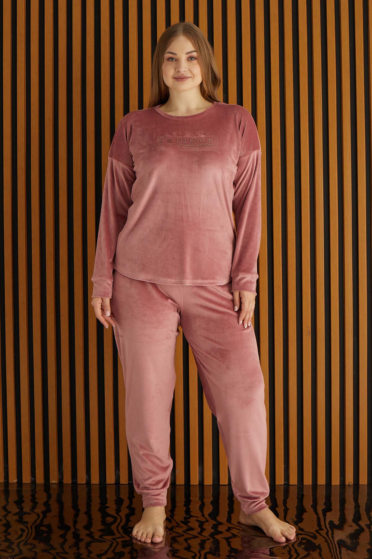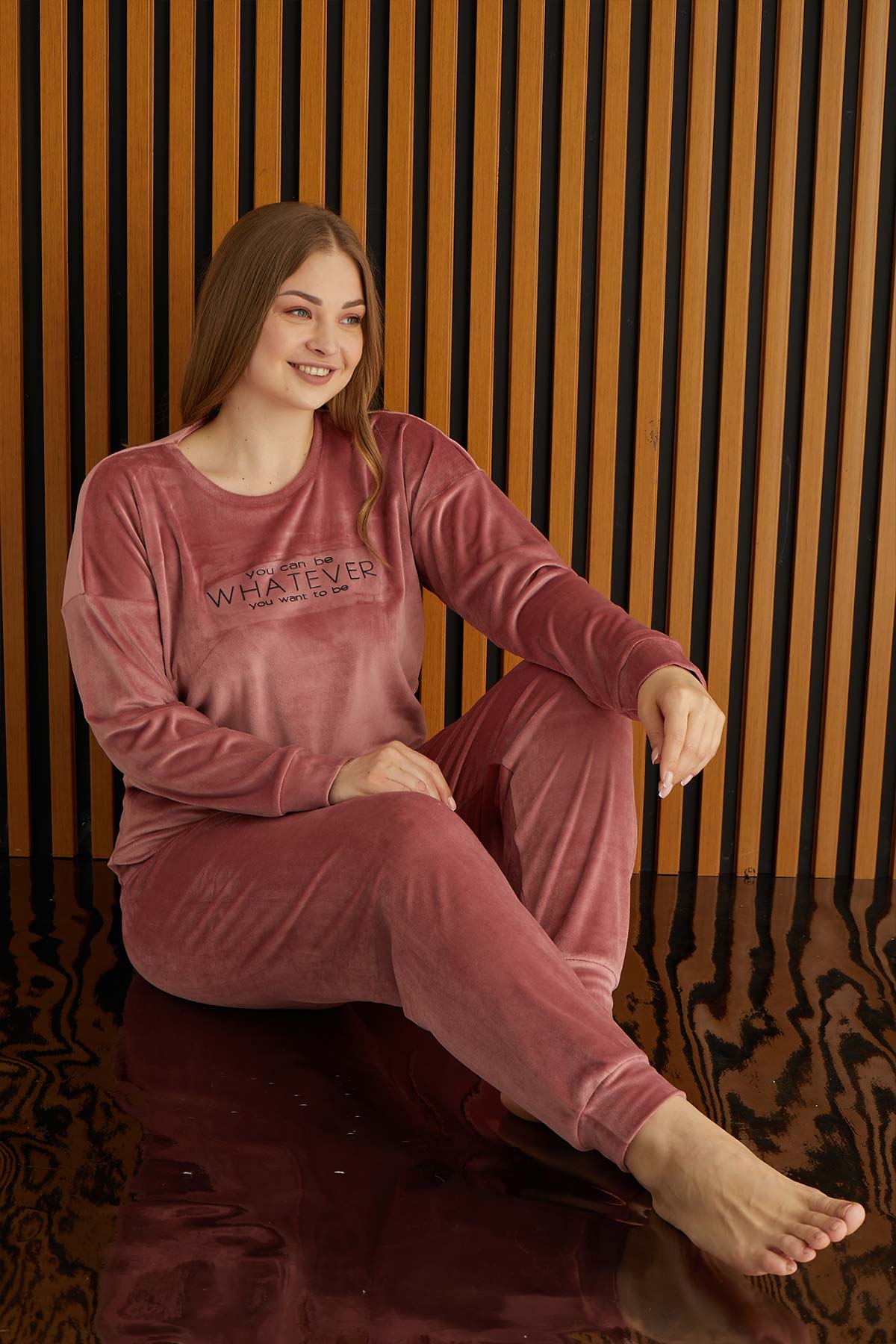Pijamoni Kadın Büyük Beden Pijama Takımı Uzun Kollu Kadife Paça Manşetli Önü Yazılı - Gülkurusu