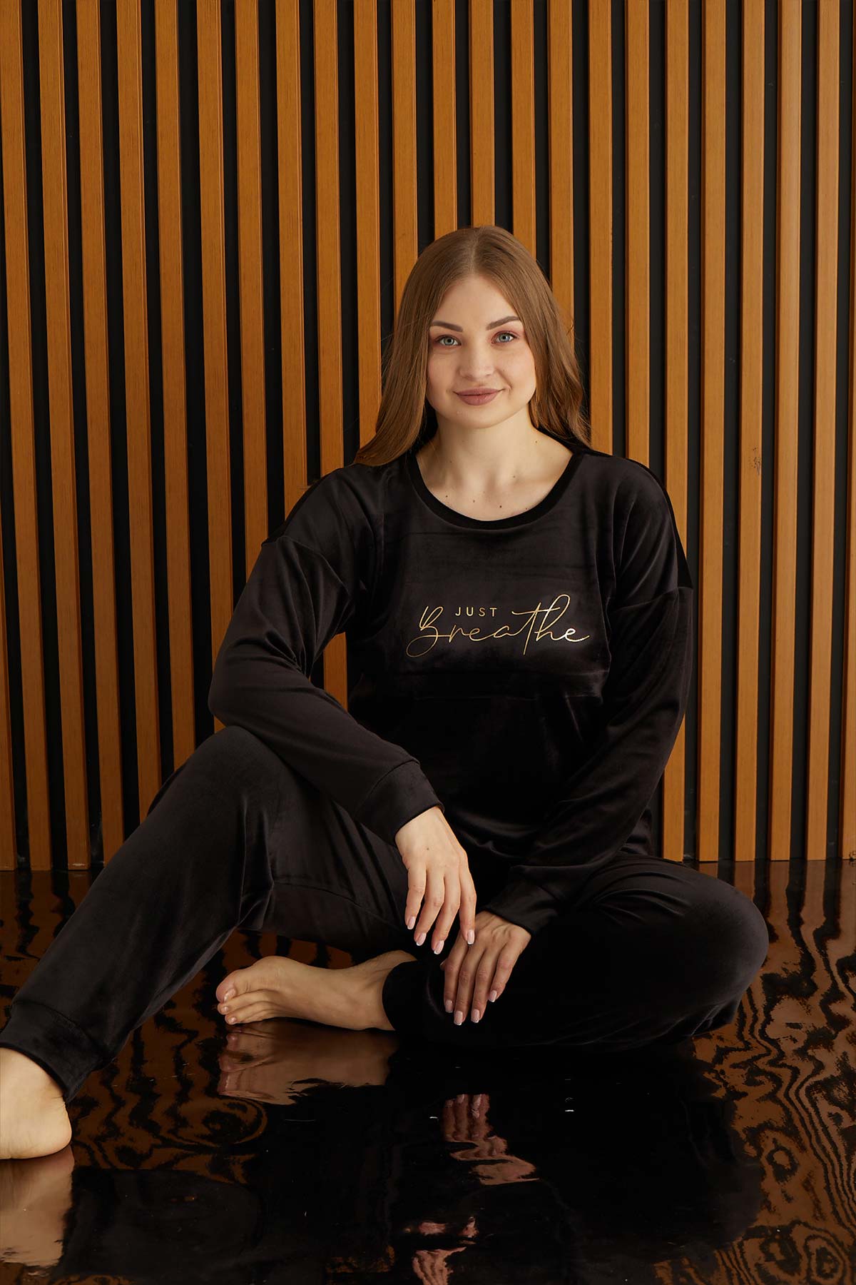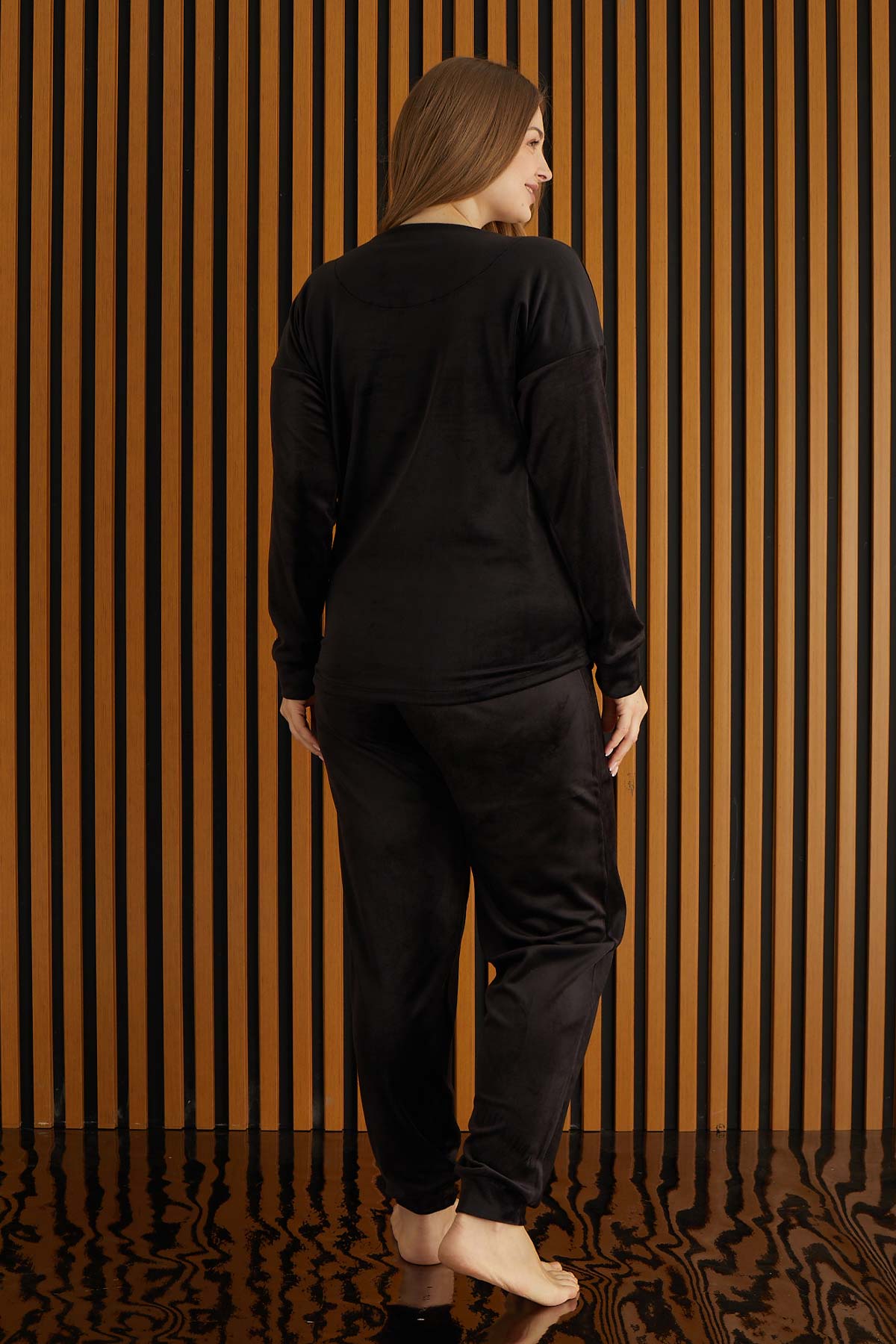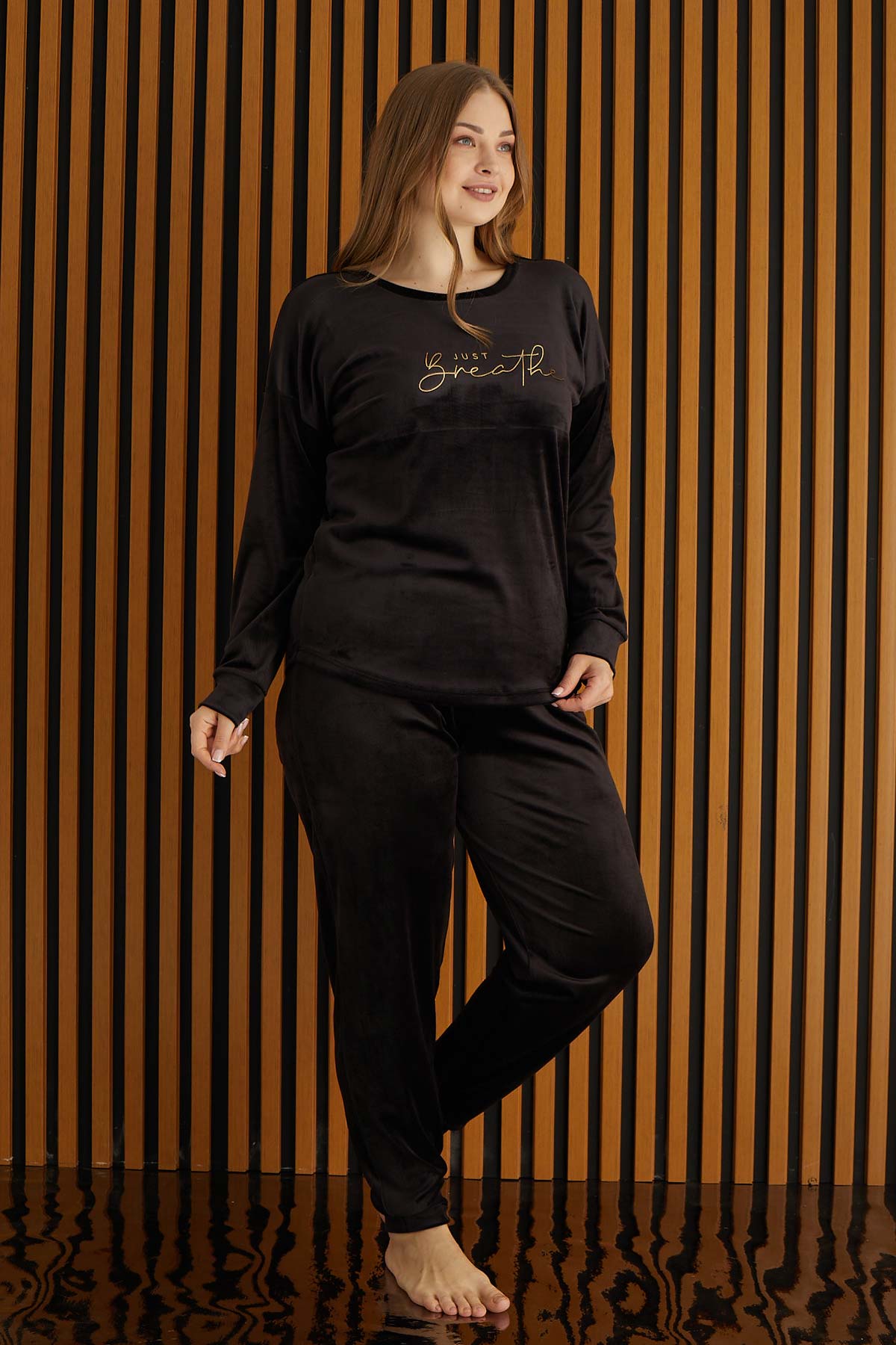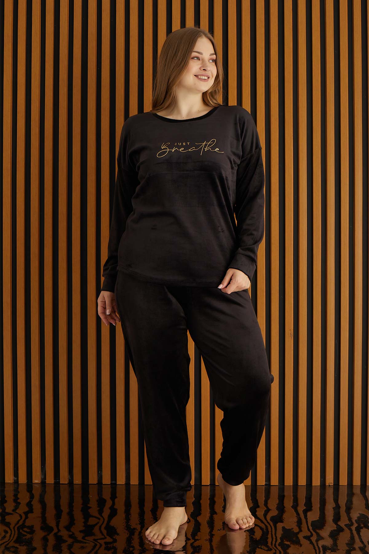 Pijamoni Kadın Büyük Beden Pijama Takımı Uzun Kollu Kadife Paça Manşetli Önü Yazılı - Siyah
