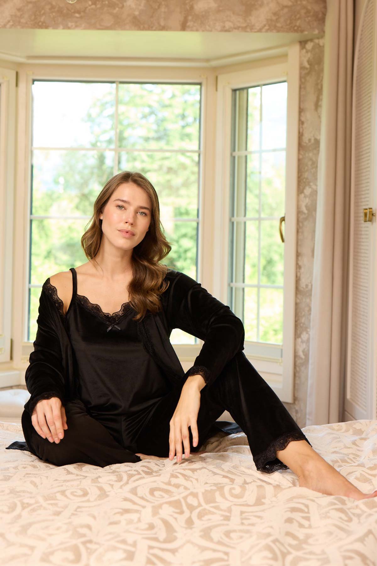 Pijamoni Kadın Kadife 3'lü Pijama Takımı İp Askılı Dantel Detaylı - Siyah