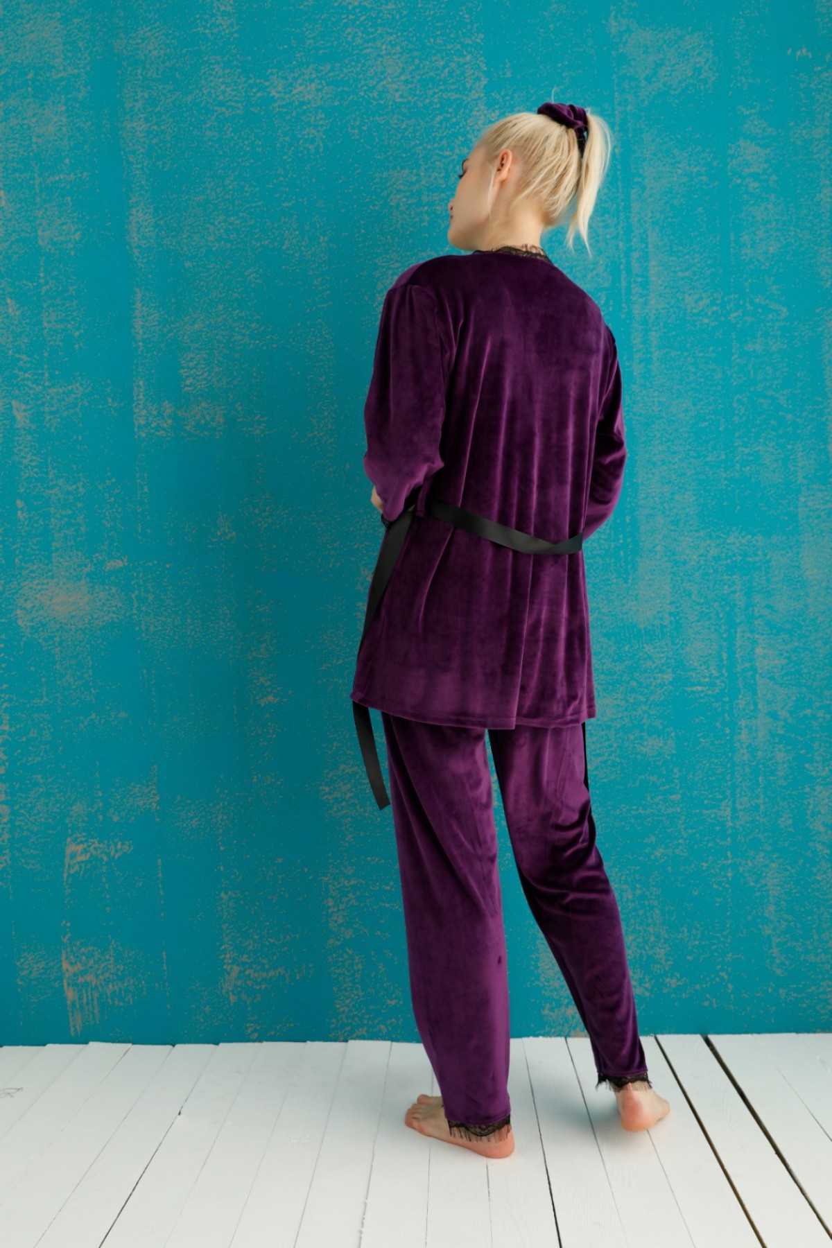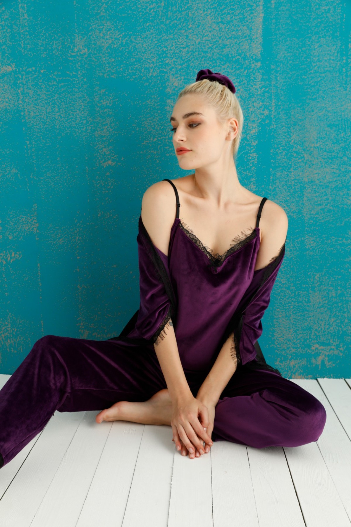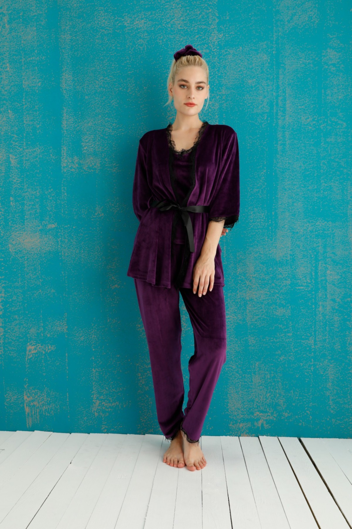 Pijamoni Kadın Kadife 3'lü Pijama Takımı İp Askılı Dantel Detaylı - Mor