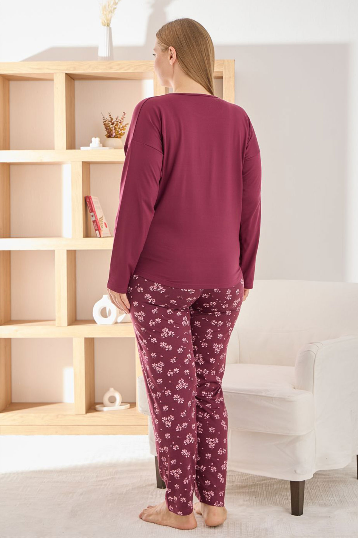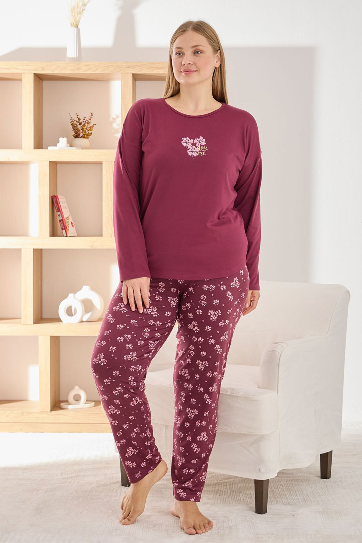 Pijamoni Kadın Pijama Takımı Uzun Kollu Bisiklet Yaka Büyük Beden Sofia Çiçekli - Mürdüm