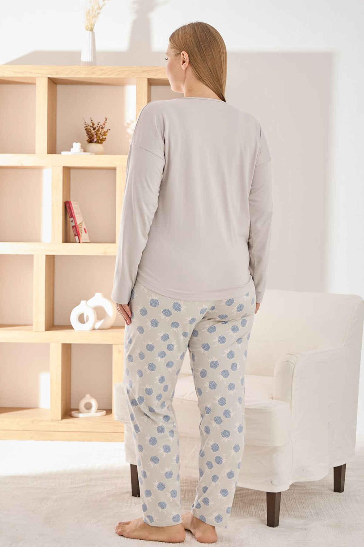 Pijamoni Kadın Pijama Takımı Uzun Kollu Bisiklet Yaka Büyük Beden Sofia Çiçekli - Taş