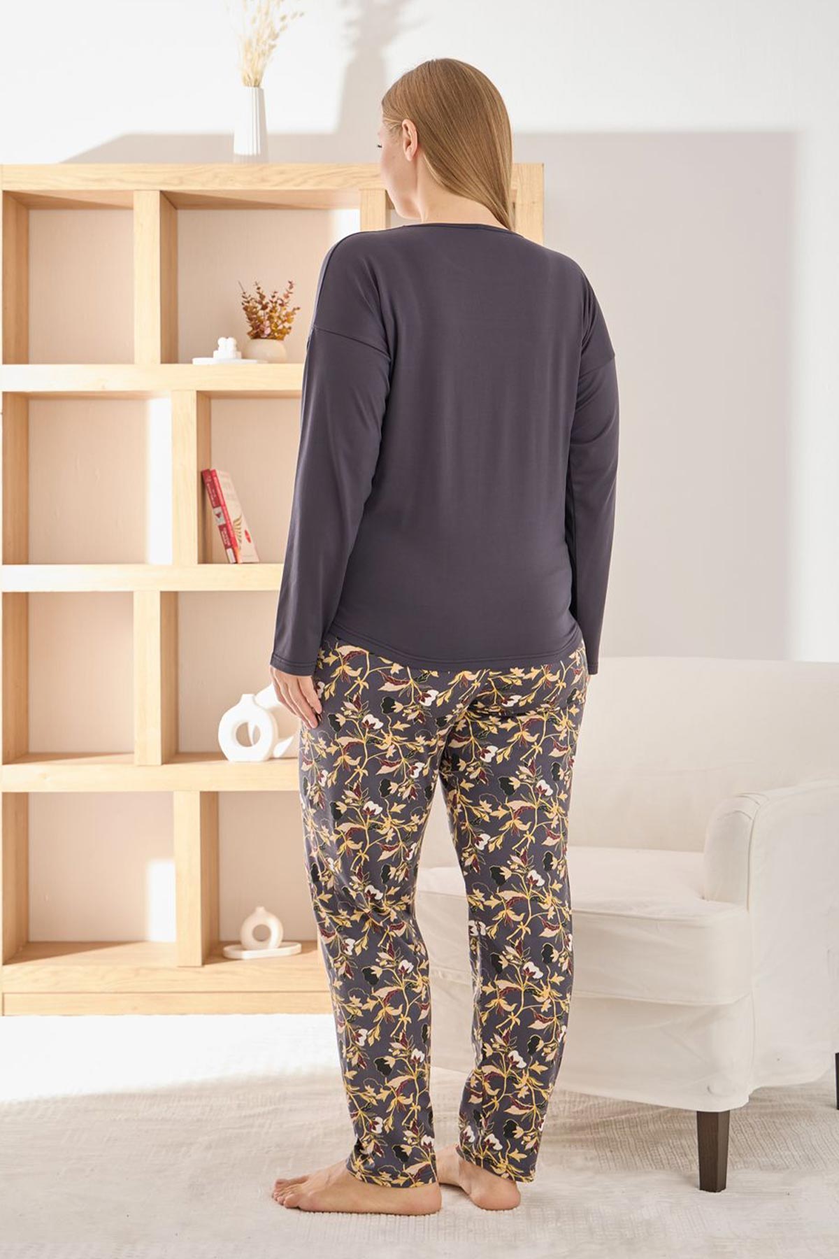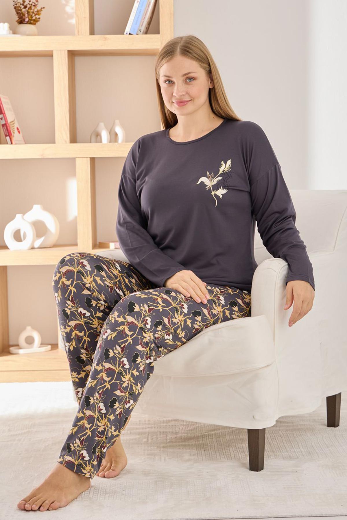 Pijamoni Kadın Pijama Takımı Uzun Kollu Bisiklet Yaka Büyük Beden Sofia Yaprak Desenli - Lacivert