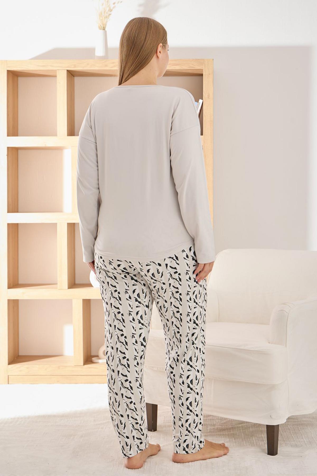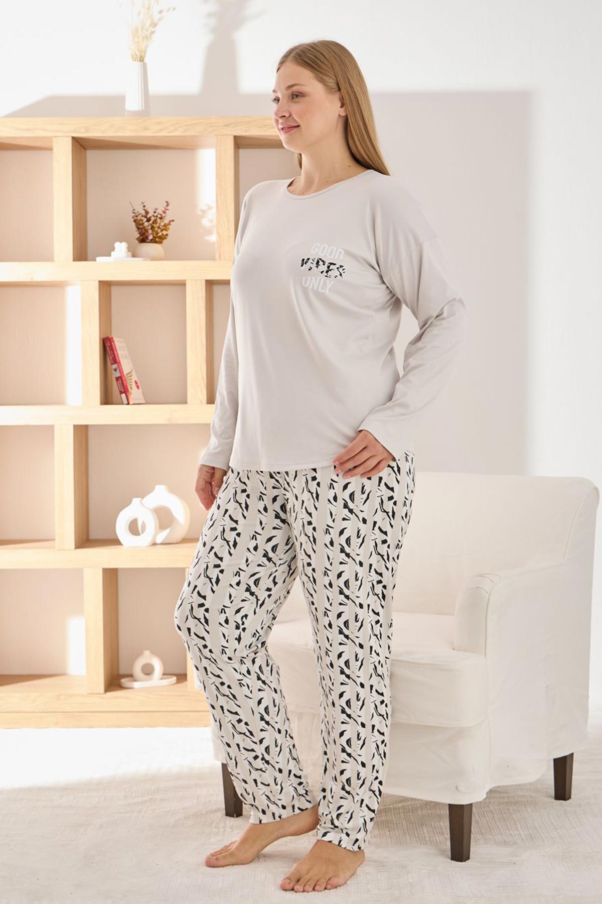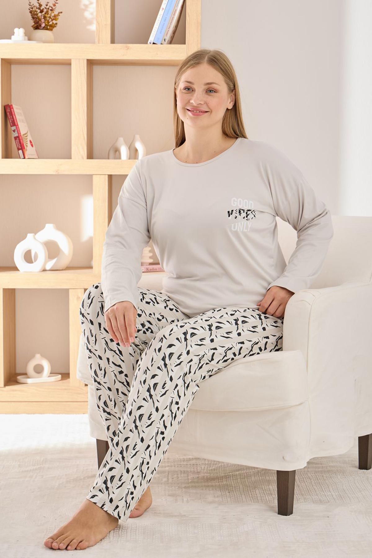 Pijamoni Kadın Pijama Takımı Uzun Kollu Bisiklet Yaka Büyük Beden Sofia Yazı Baskılı - Taş