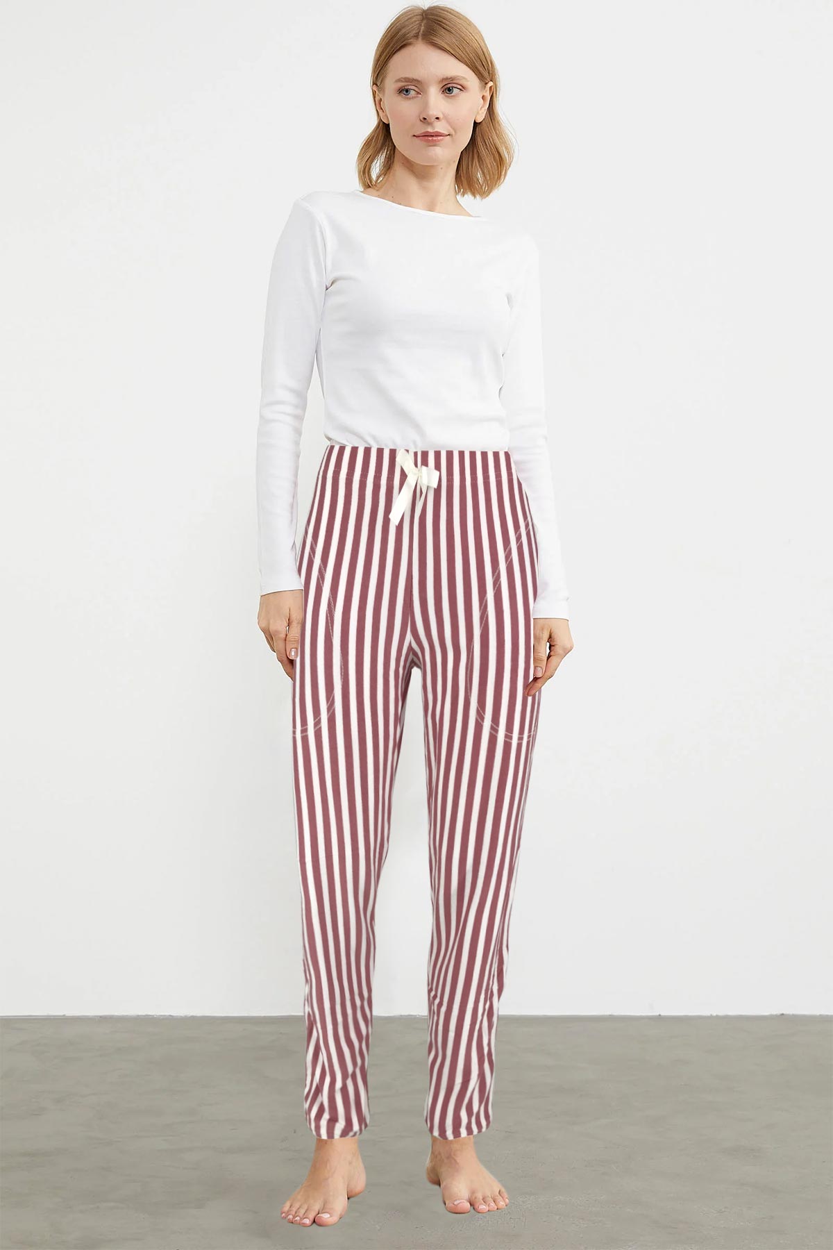 Pijamoni Kadın Tek Alt Pijama Desenli Süet - Beyaz/Gülkurusu