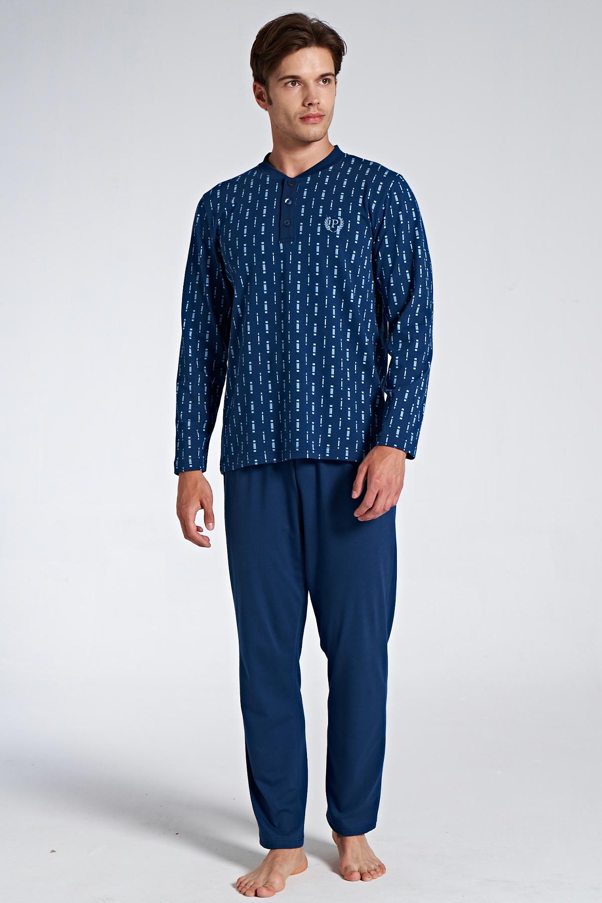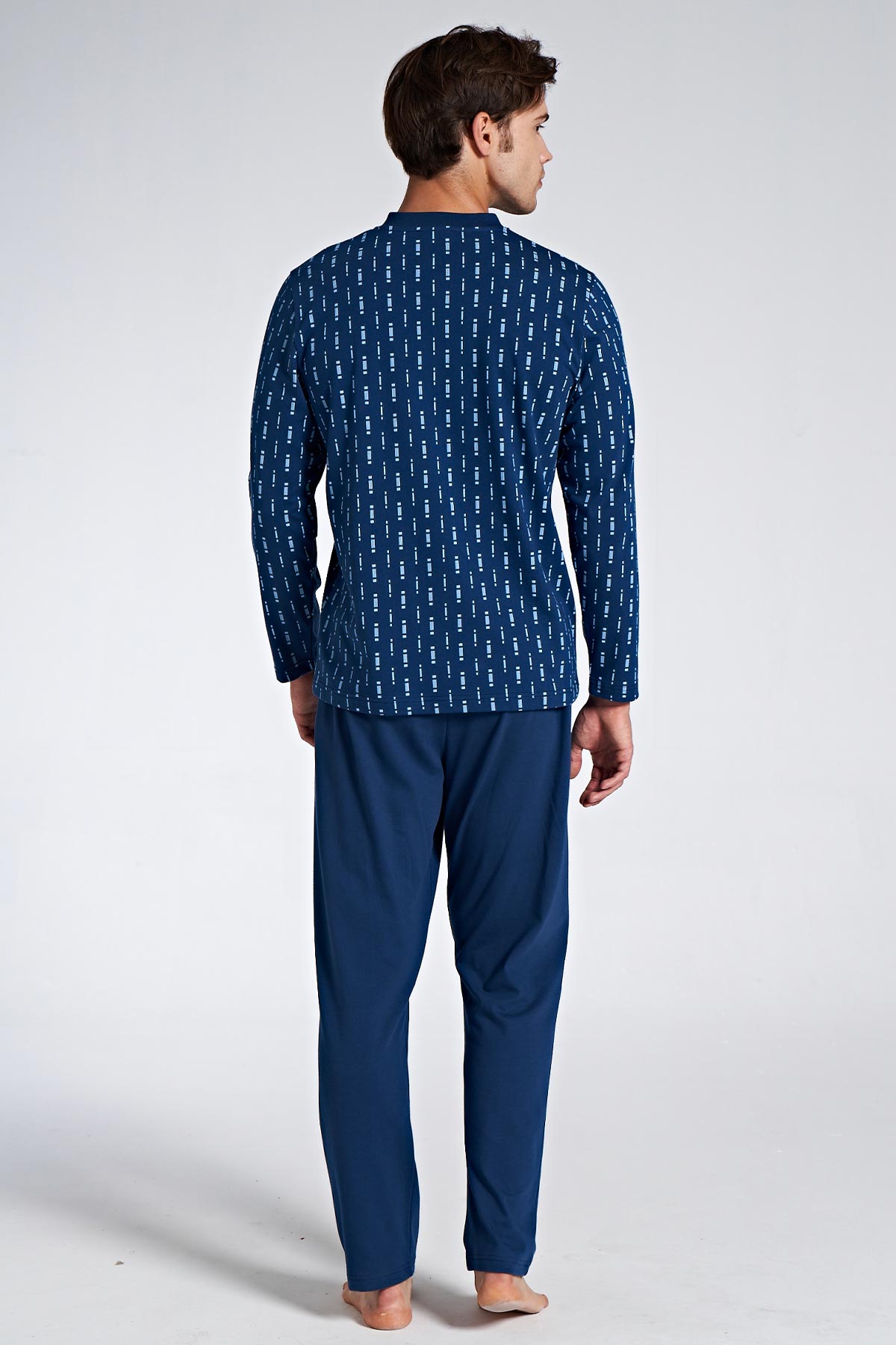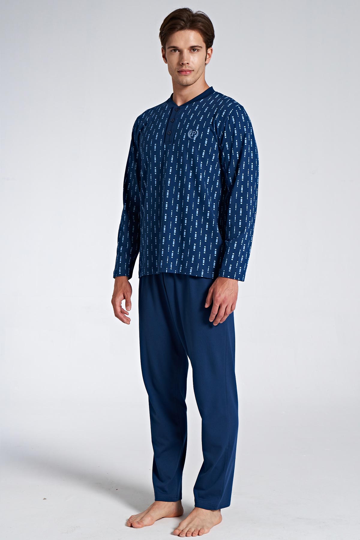 Pınarca Erkek Pijama Takımı Uzun Kollu Düğmeli Desenli Büyük Beden - Mavi