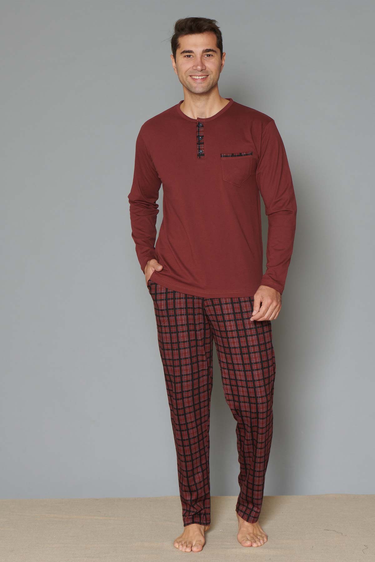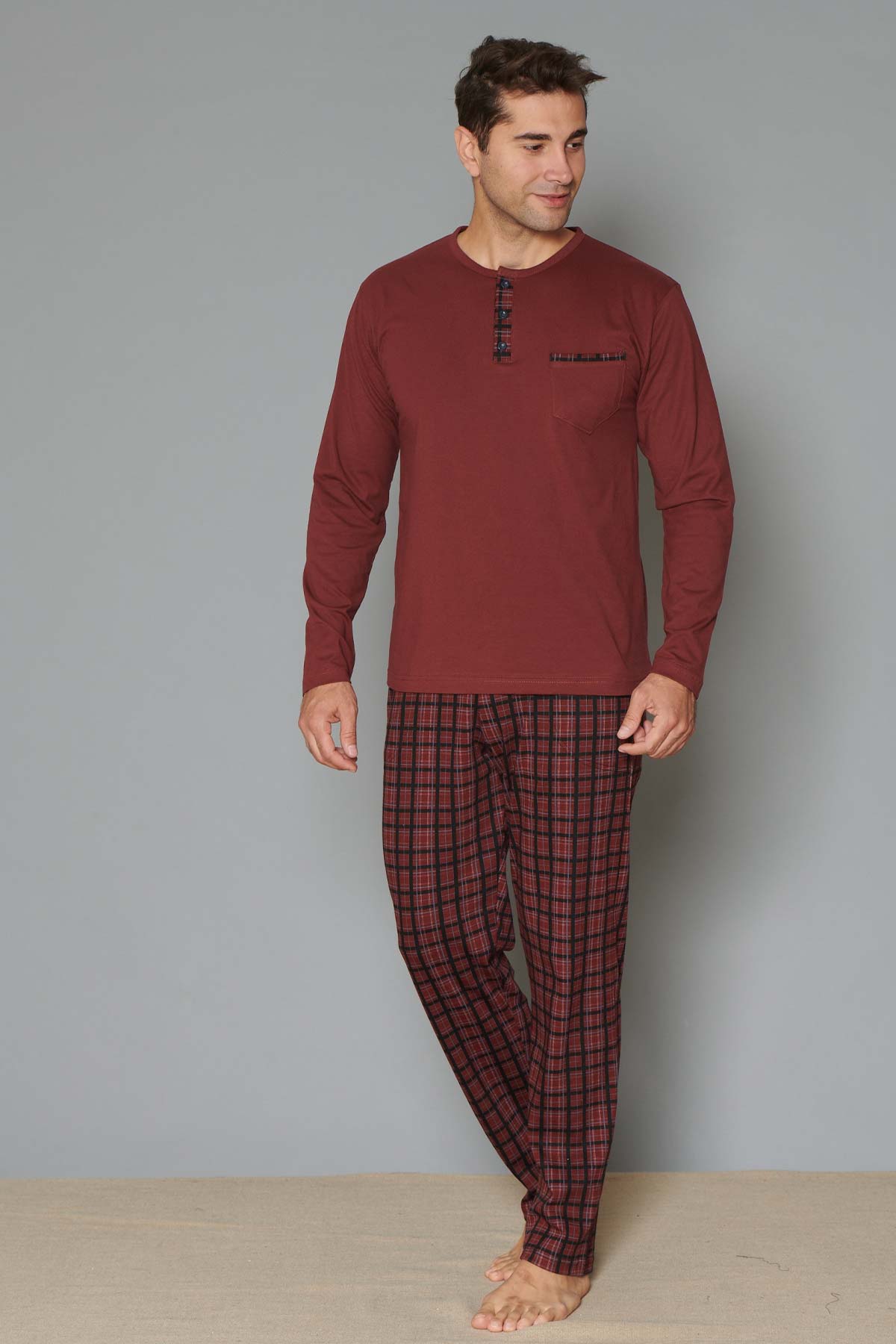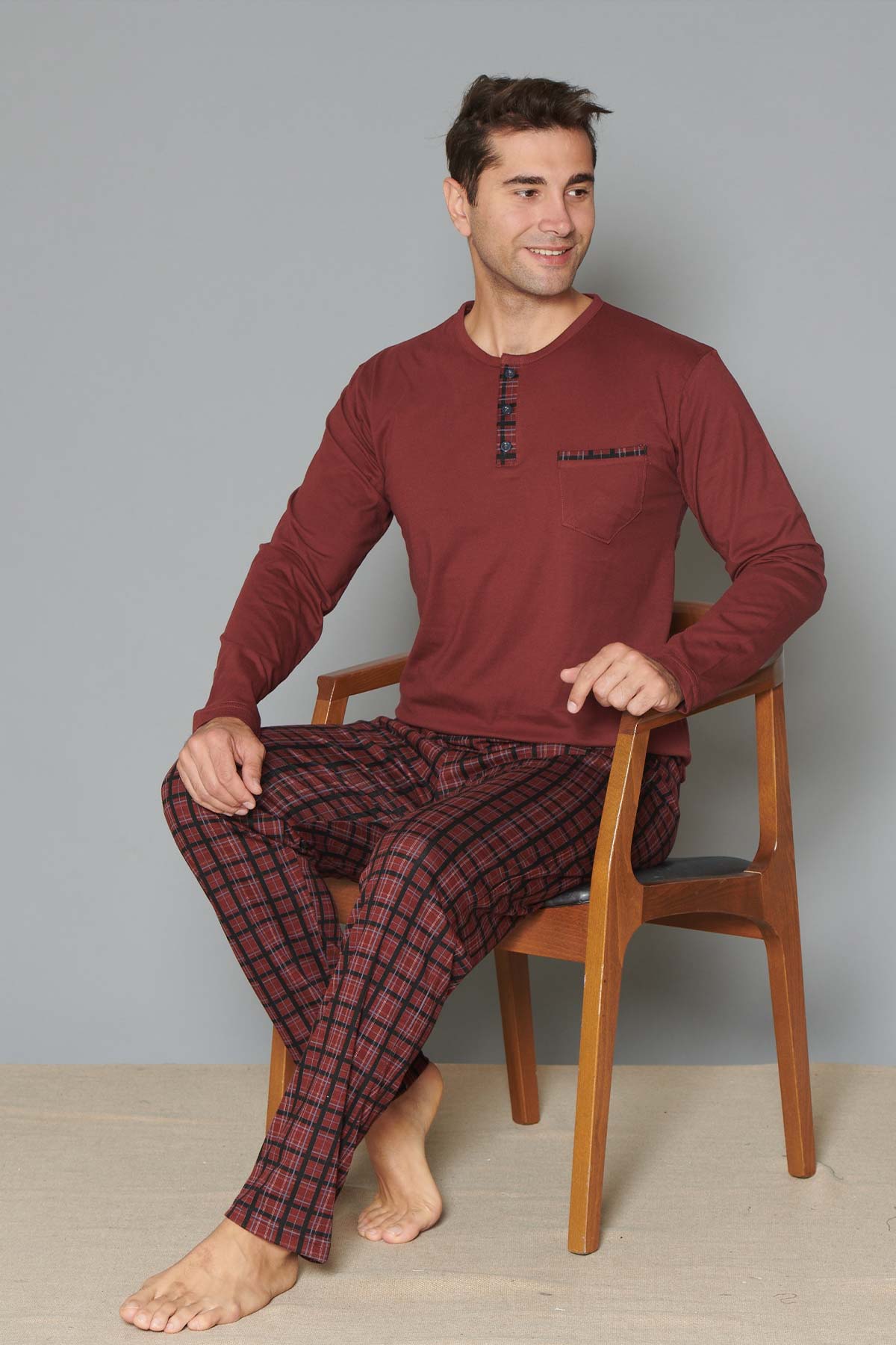 Pınarca Erkek Pijama Takımı Uzun Kollu Düğmeli Altı Ekose İnterlok - Bordo