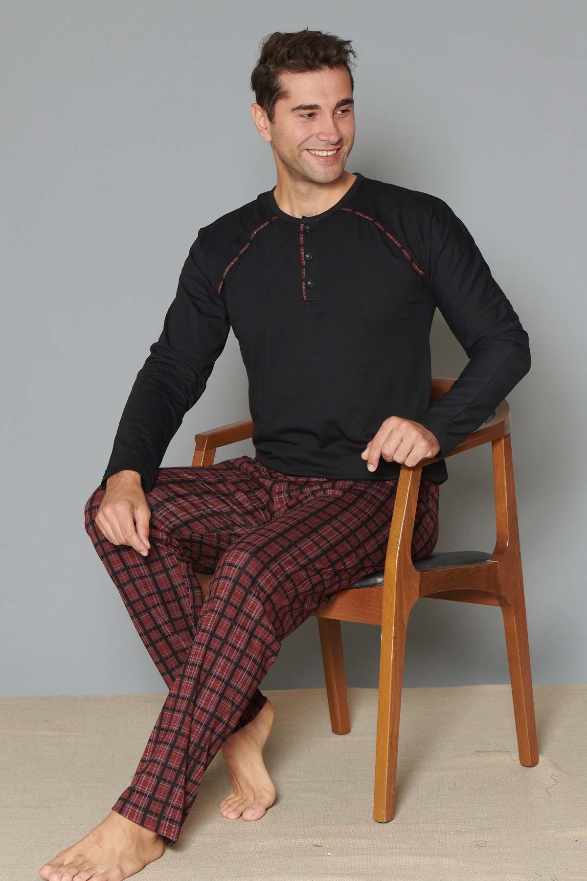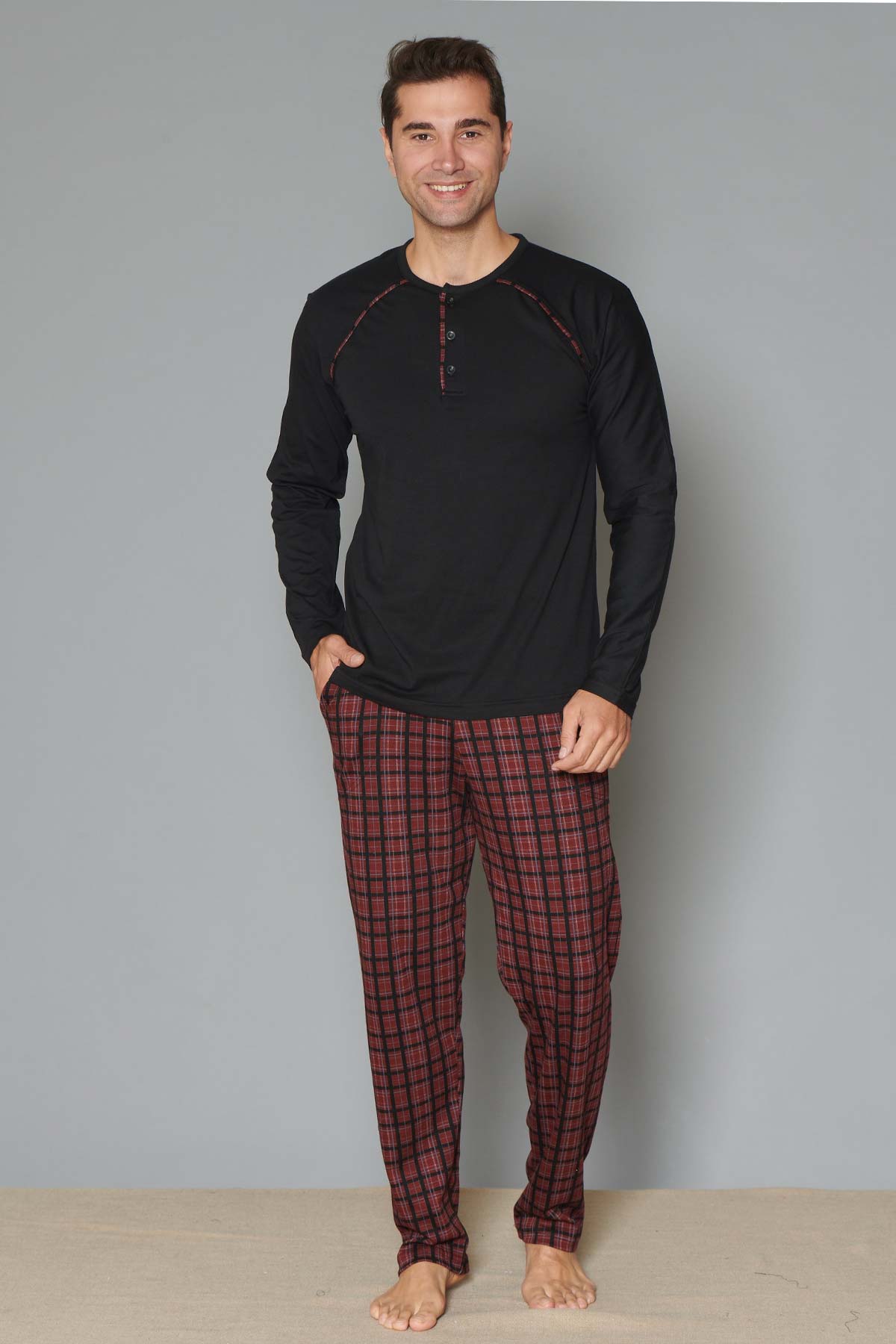 Pınarca Erkek Pijama Takımı Uzun Kollu Düğmeli Altı Ekose İnterlok - Siyah