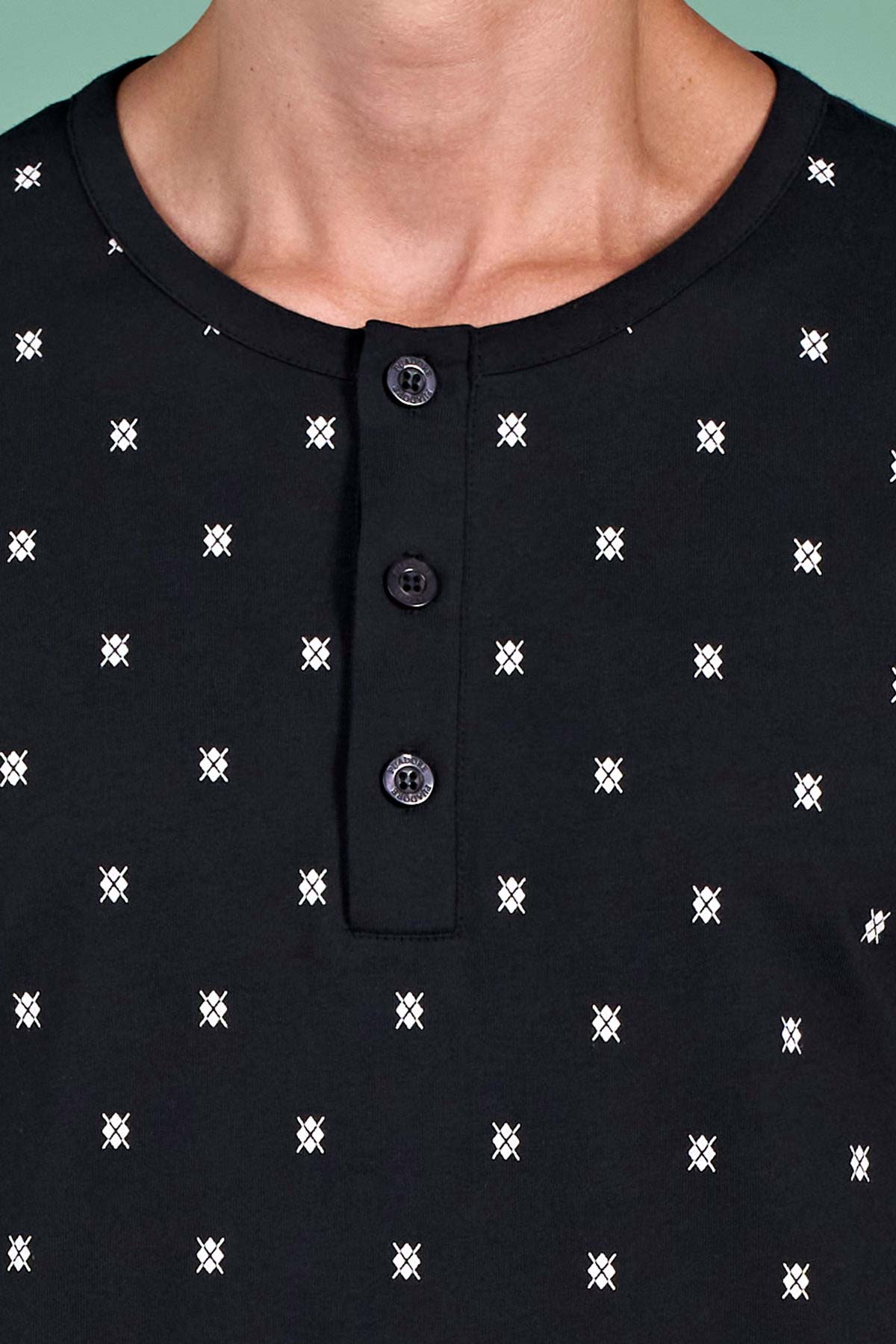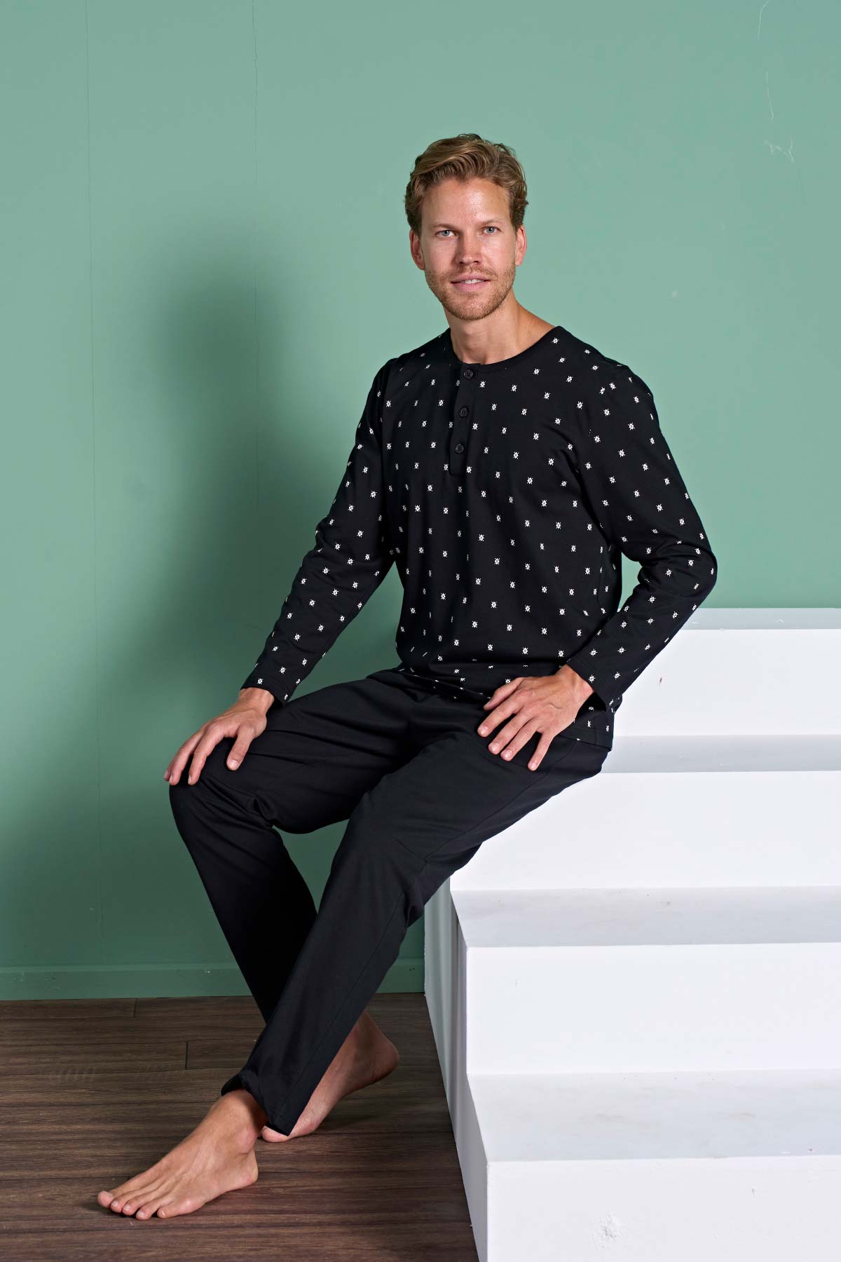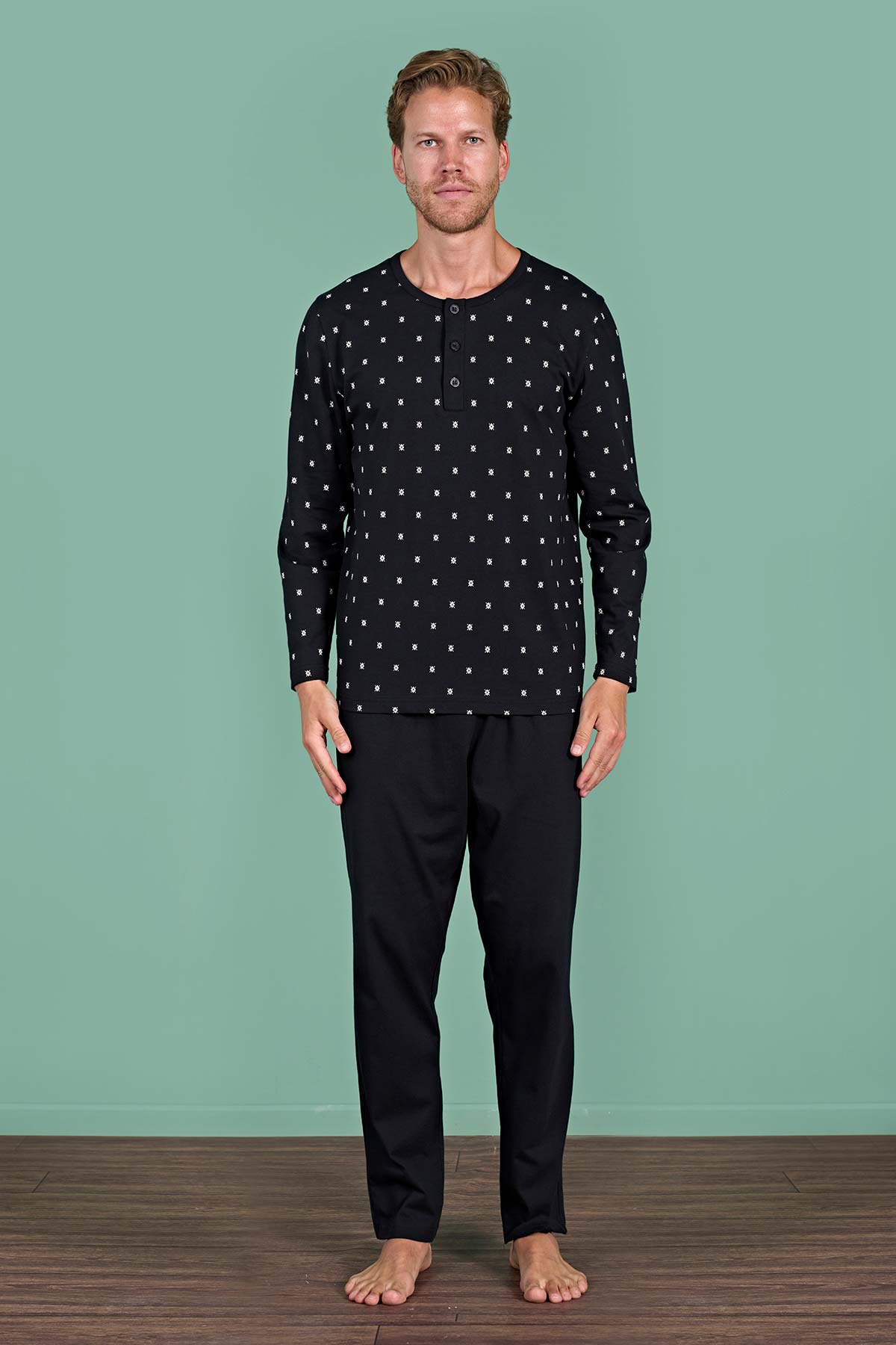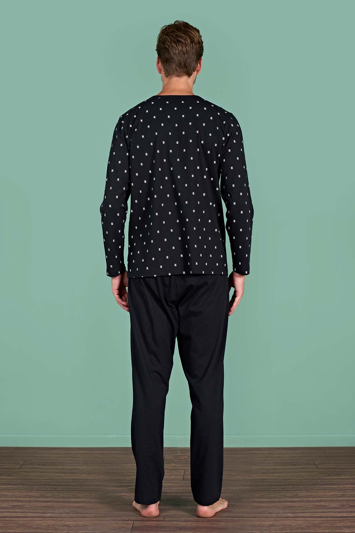 Pınarca Erkek Pijama Takımı Uzun Kollu Düğmeli Desenli Pamuklu - Siyah