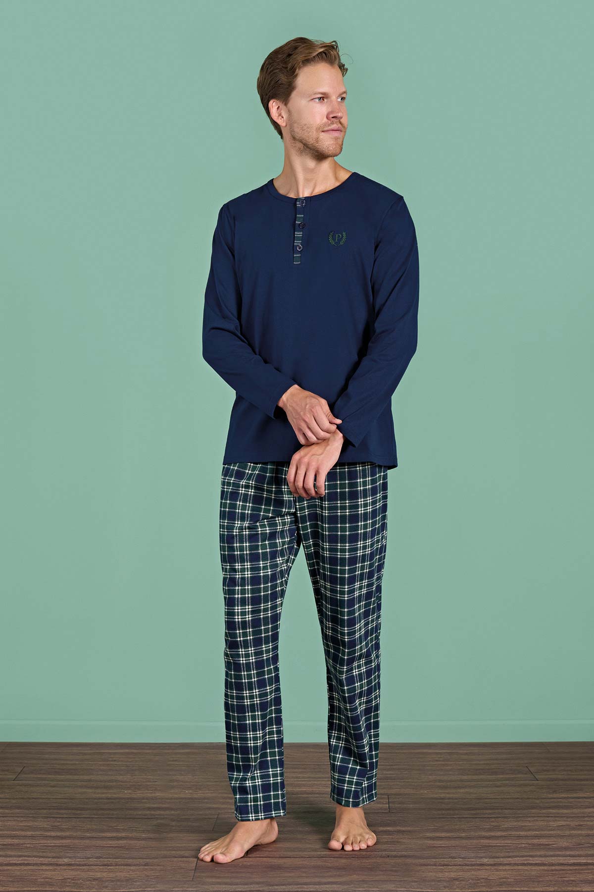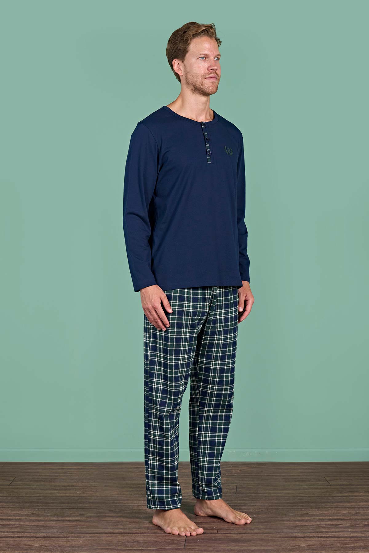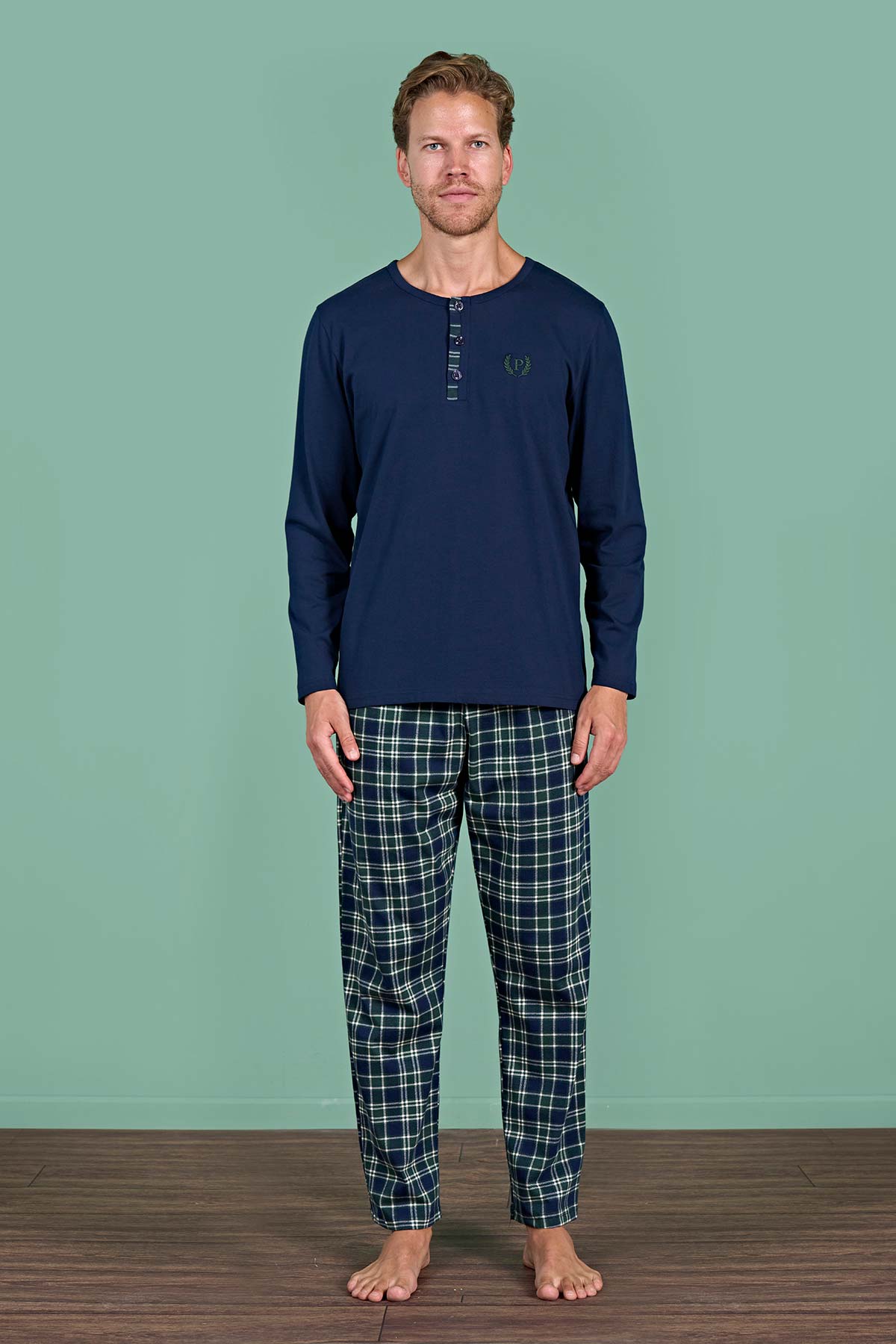 Pınarca Erkek Pijama Takımı Uzun Kollu Düğmeli Ekoseli Pamuklu Eşli - Lacivert