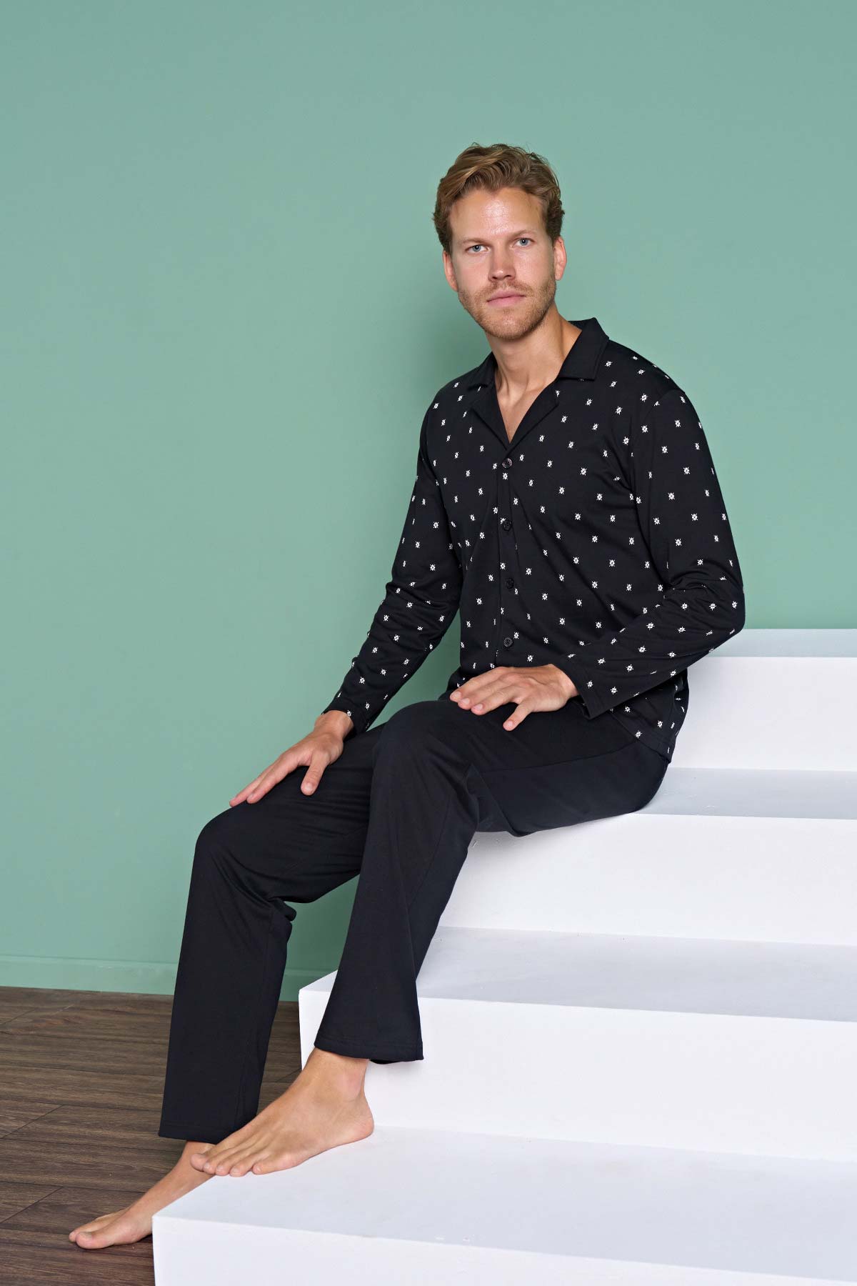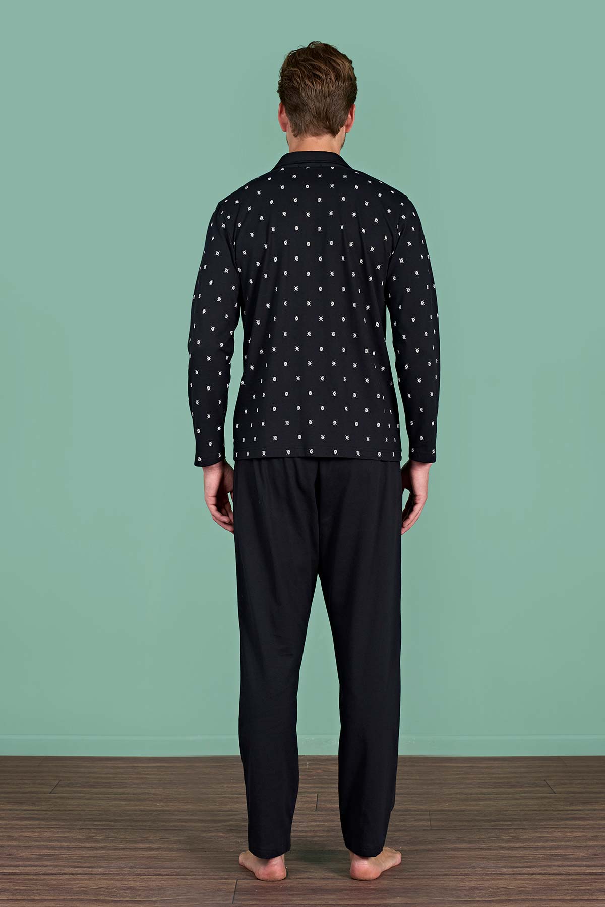 Pınarca Erkek Pijama Takımı Uzun Kollu Gömlek Yaka Desenli Pamuklu - Siyah