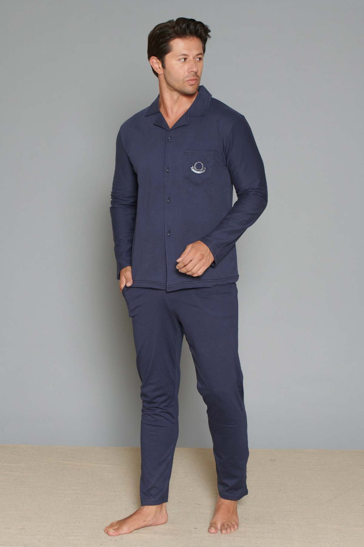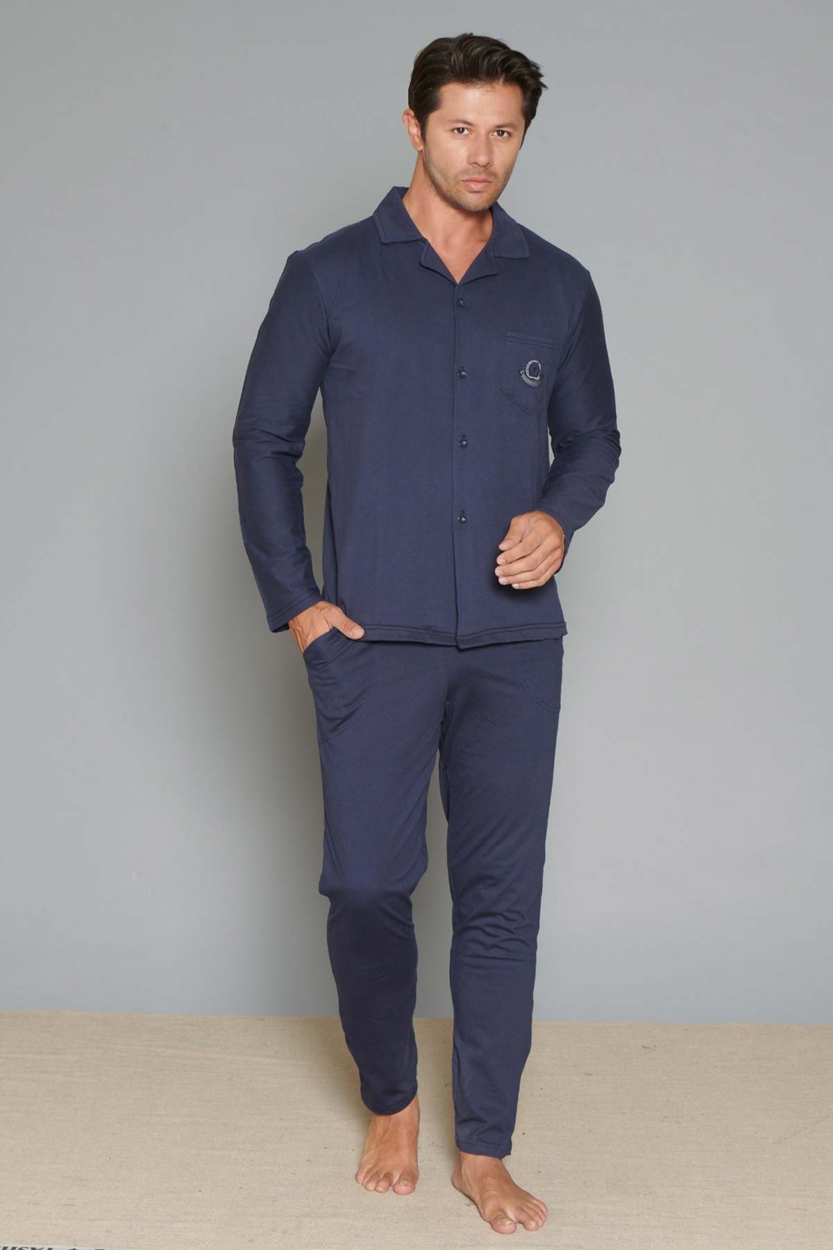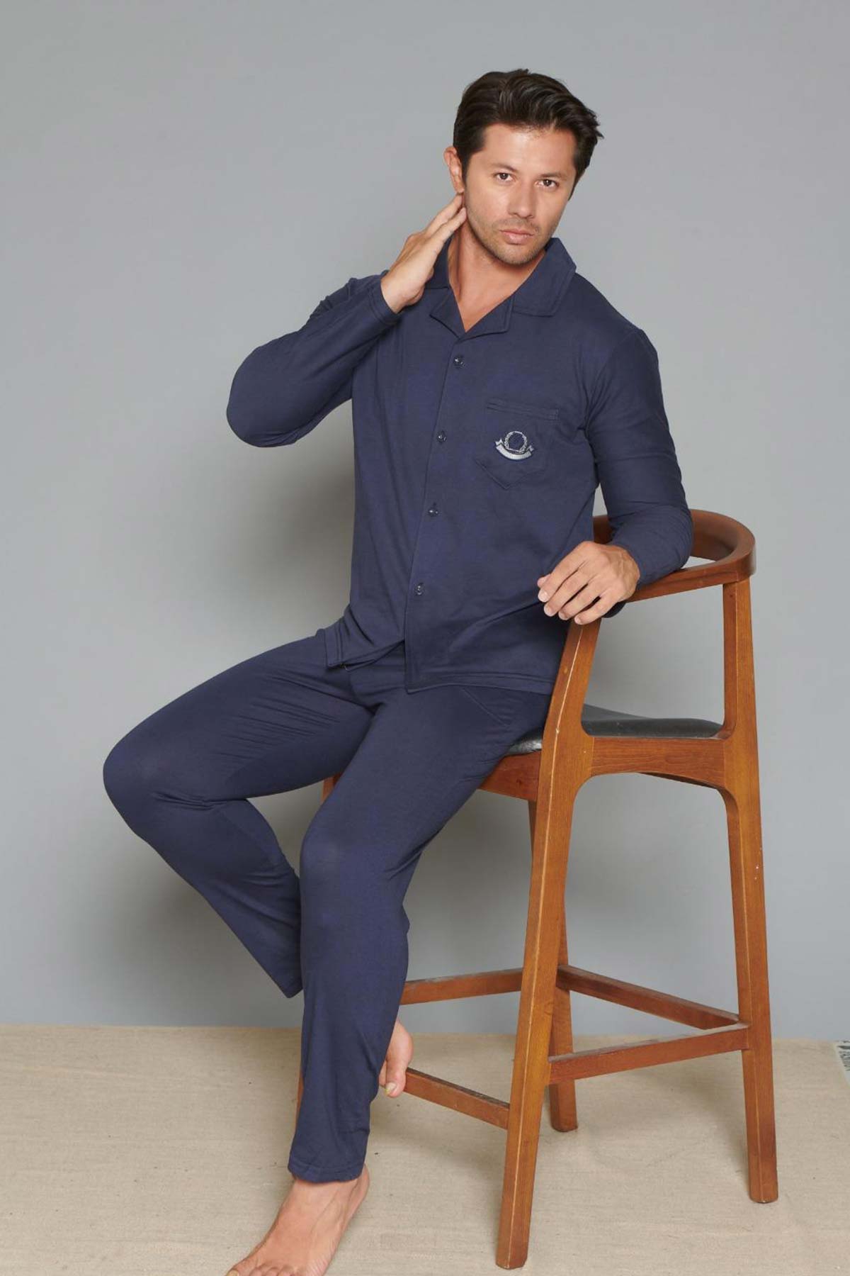 Pınarca Erkek Pijama Takımı Uzun Kollu Gömlek Yaka Düz Yaka Cepli Pamuklu - Lacivert