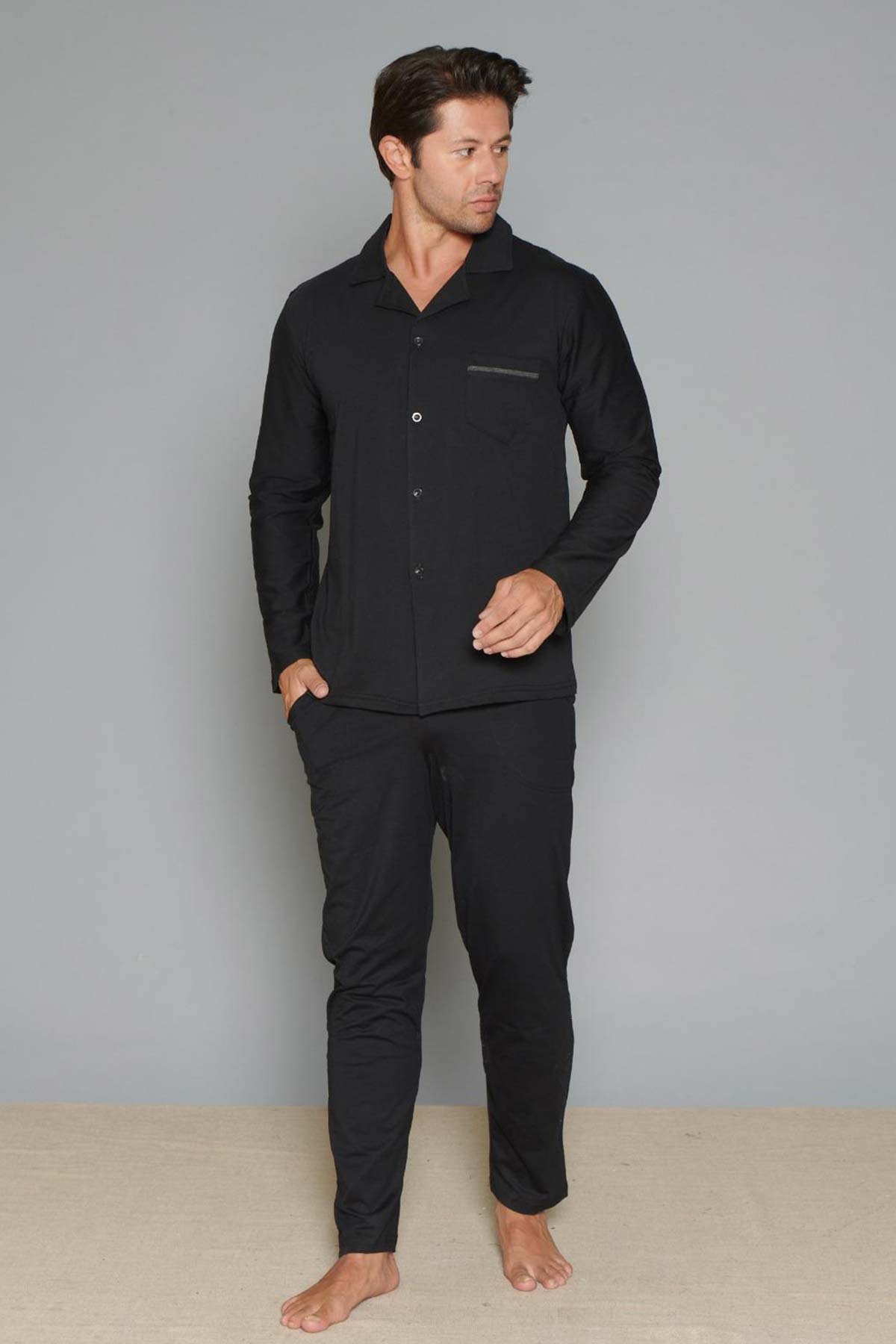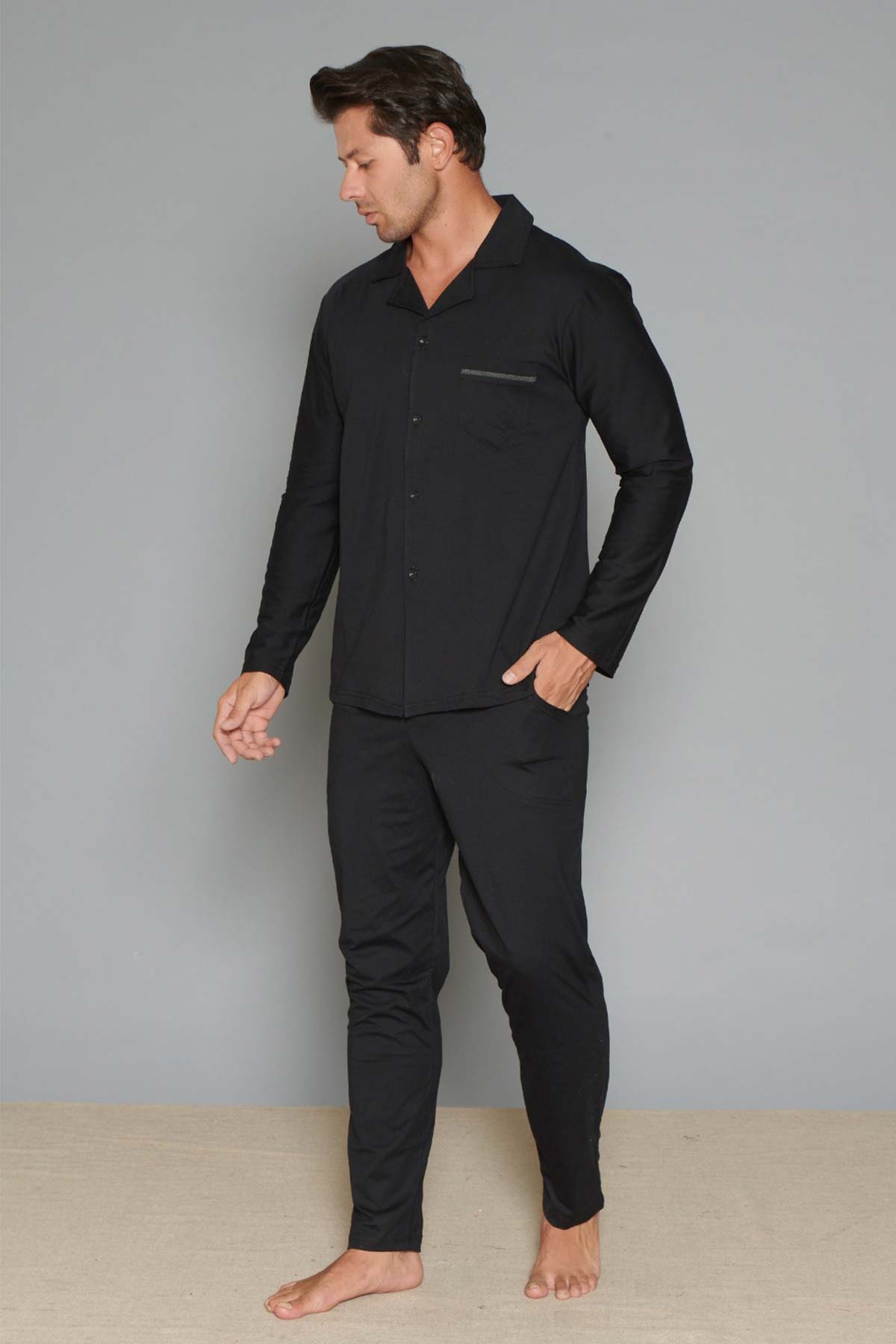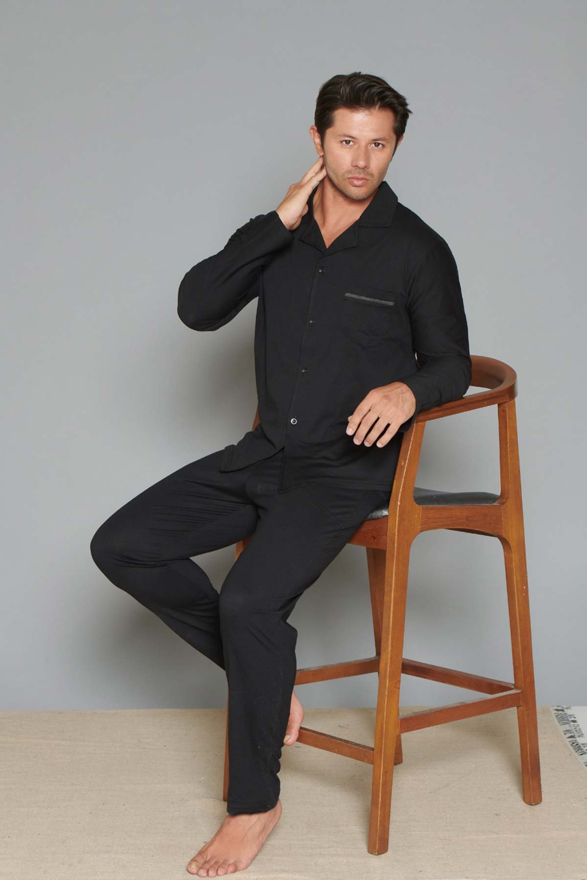 Pınarca Erkek Pijama Takımı Uzun Kollu Gömlek Yaka Düz Yaka Çizgili Cepli Pamuklu - Siyah