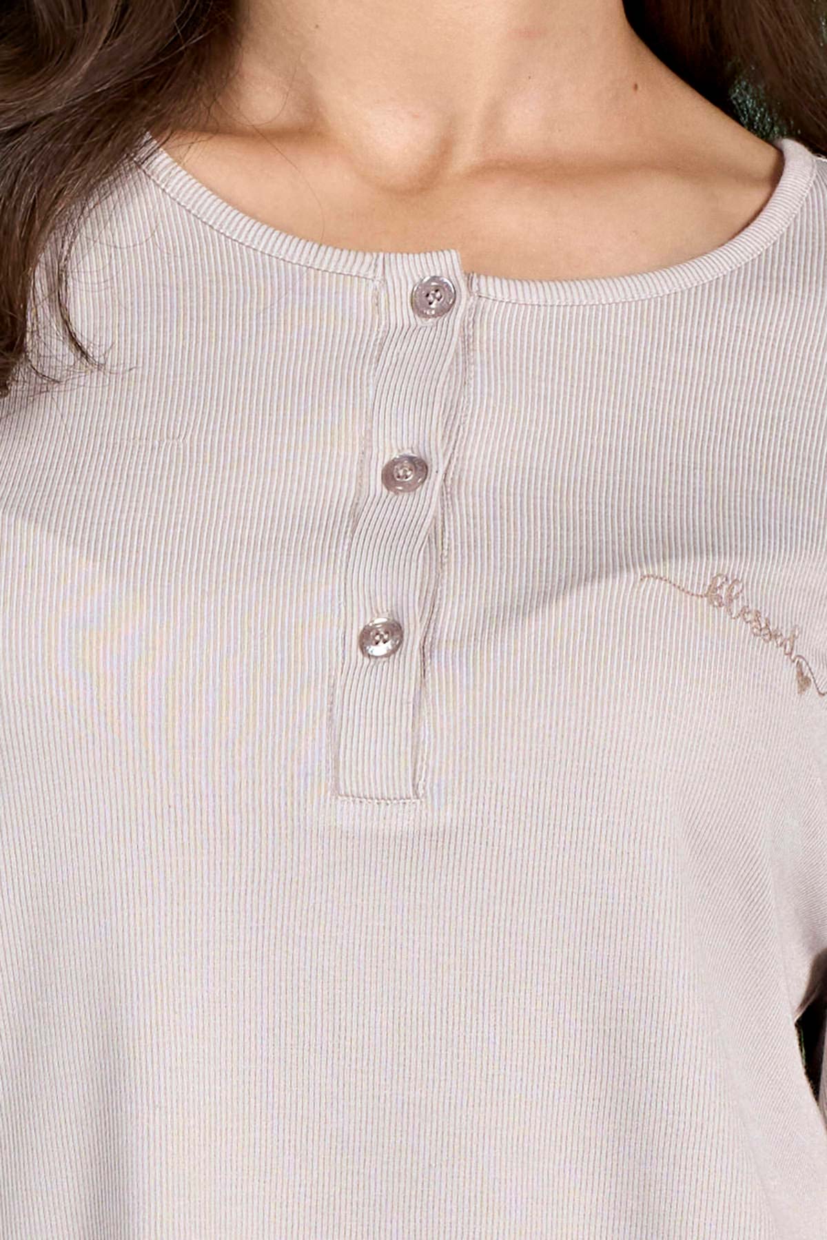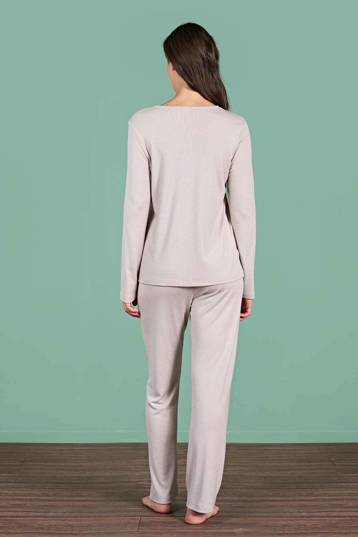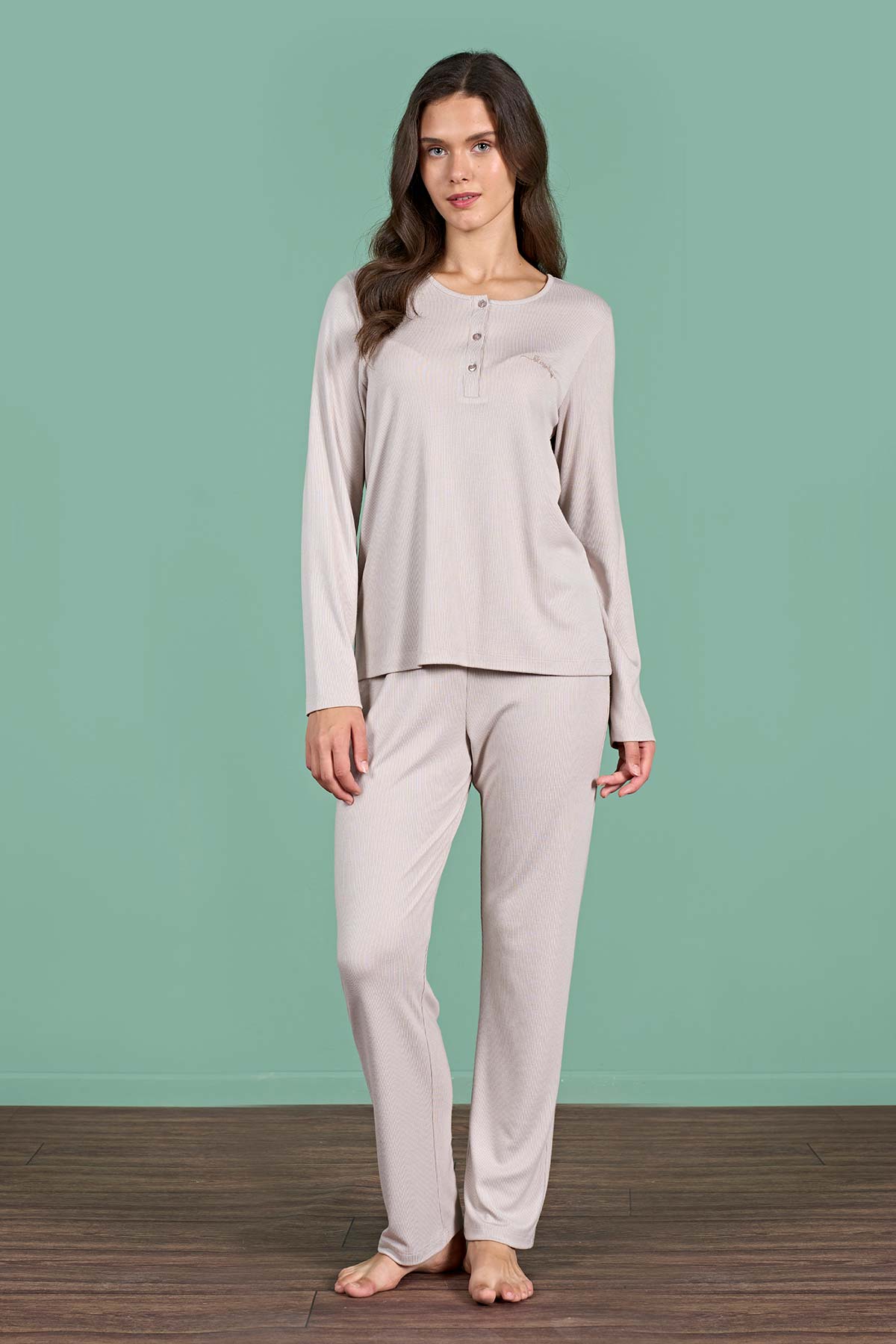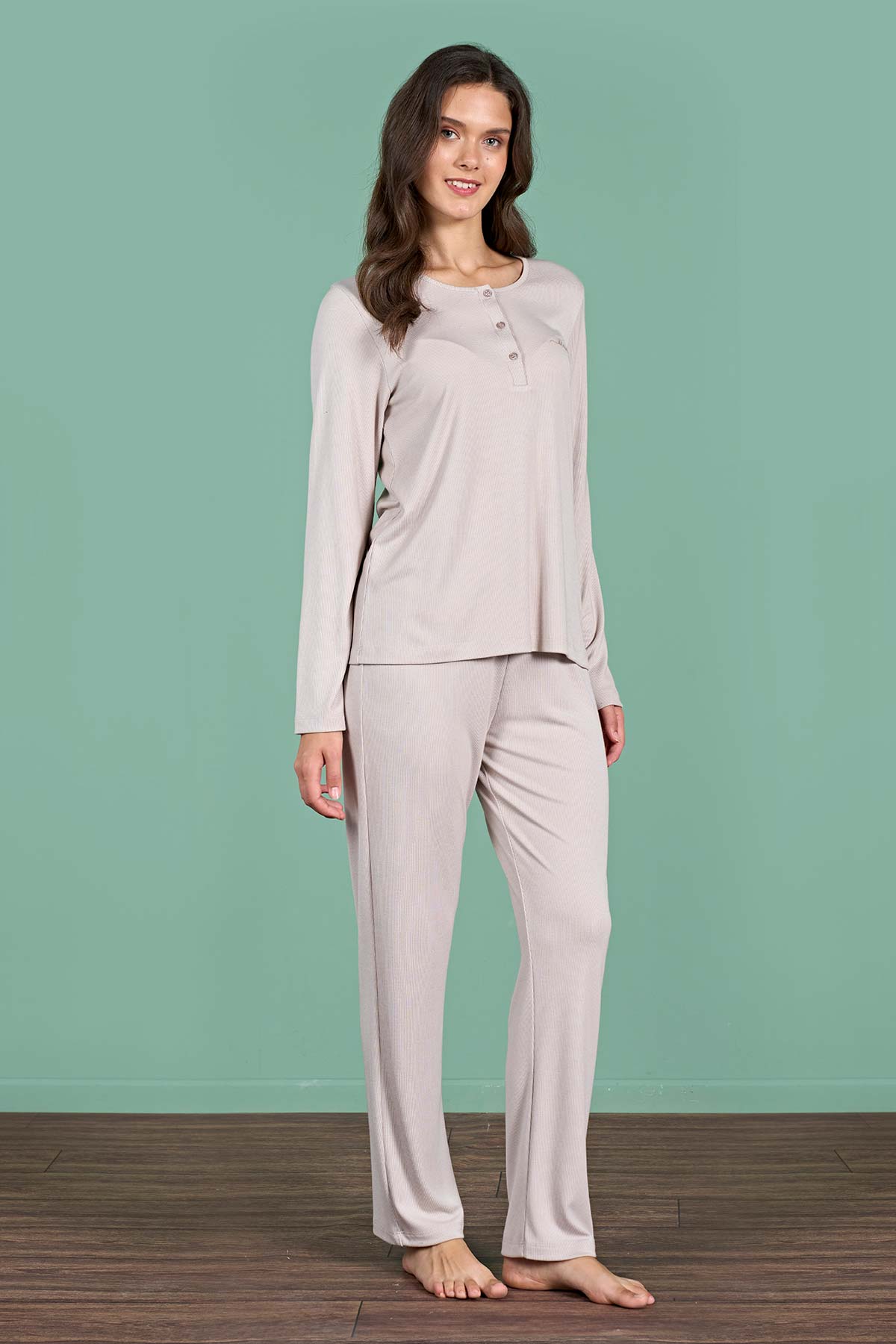 Pınarca Kadın Pijama Takımı Uzun Kollu Düğmeli Düz Melisa - Vizon