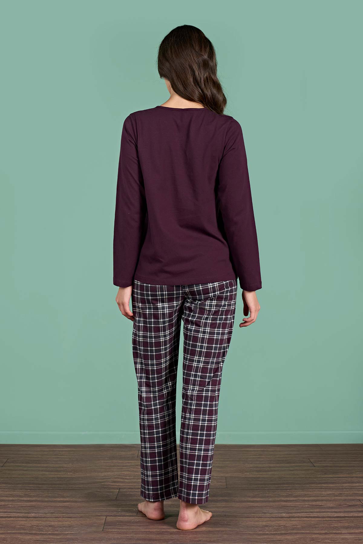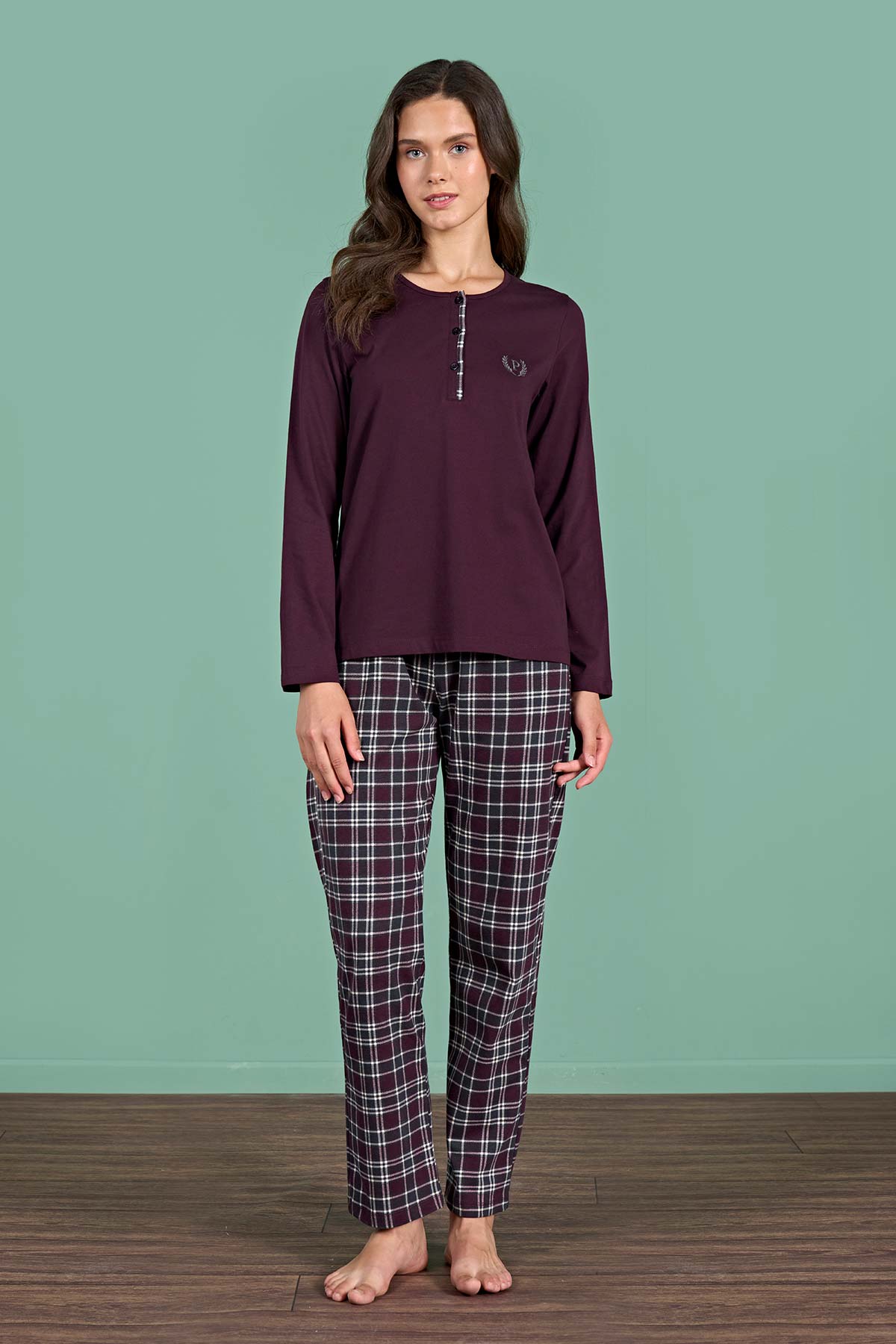 Pınarca Kadın Pijama Takımı Uzun Kollu Düğmeli Ekoseli Pamuklu Eşli - Bordo