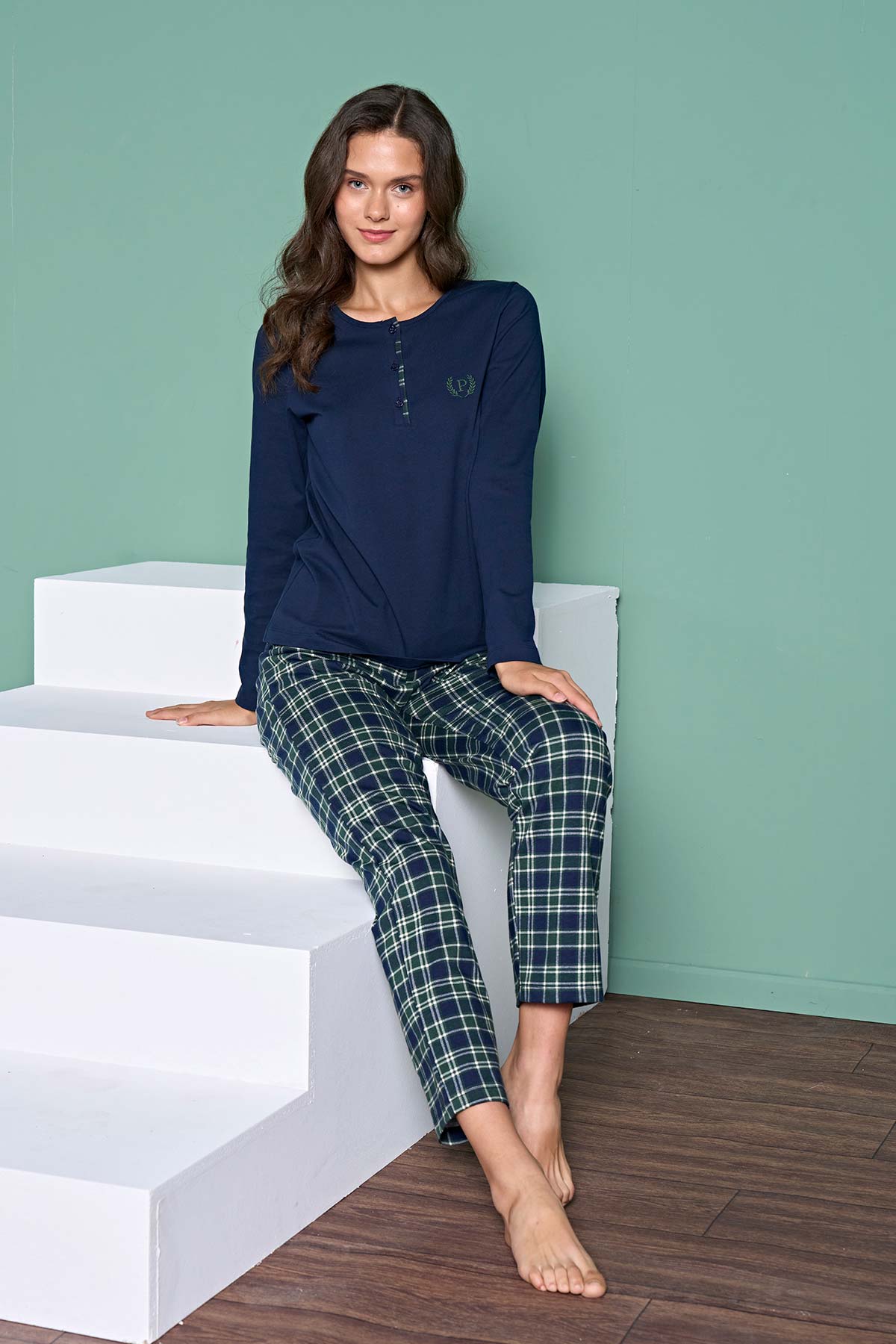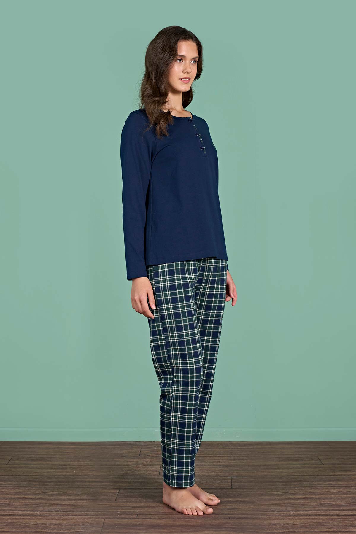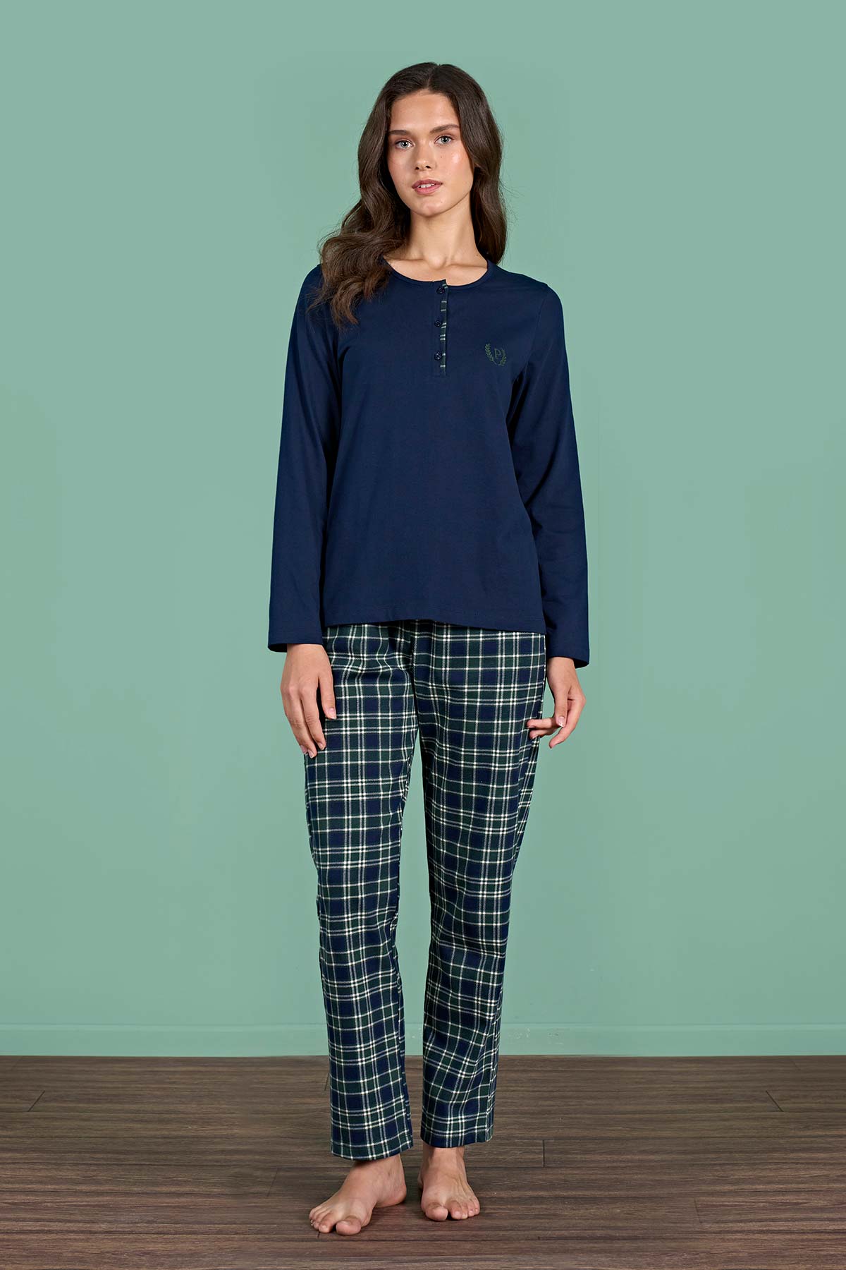 Pınarca Kadın Pijama Takımı Uzun Kollu Düğmeli Ekoseli Pamuklu Eşli - Lacivert