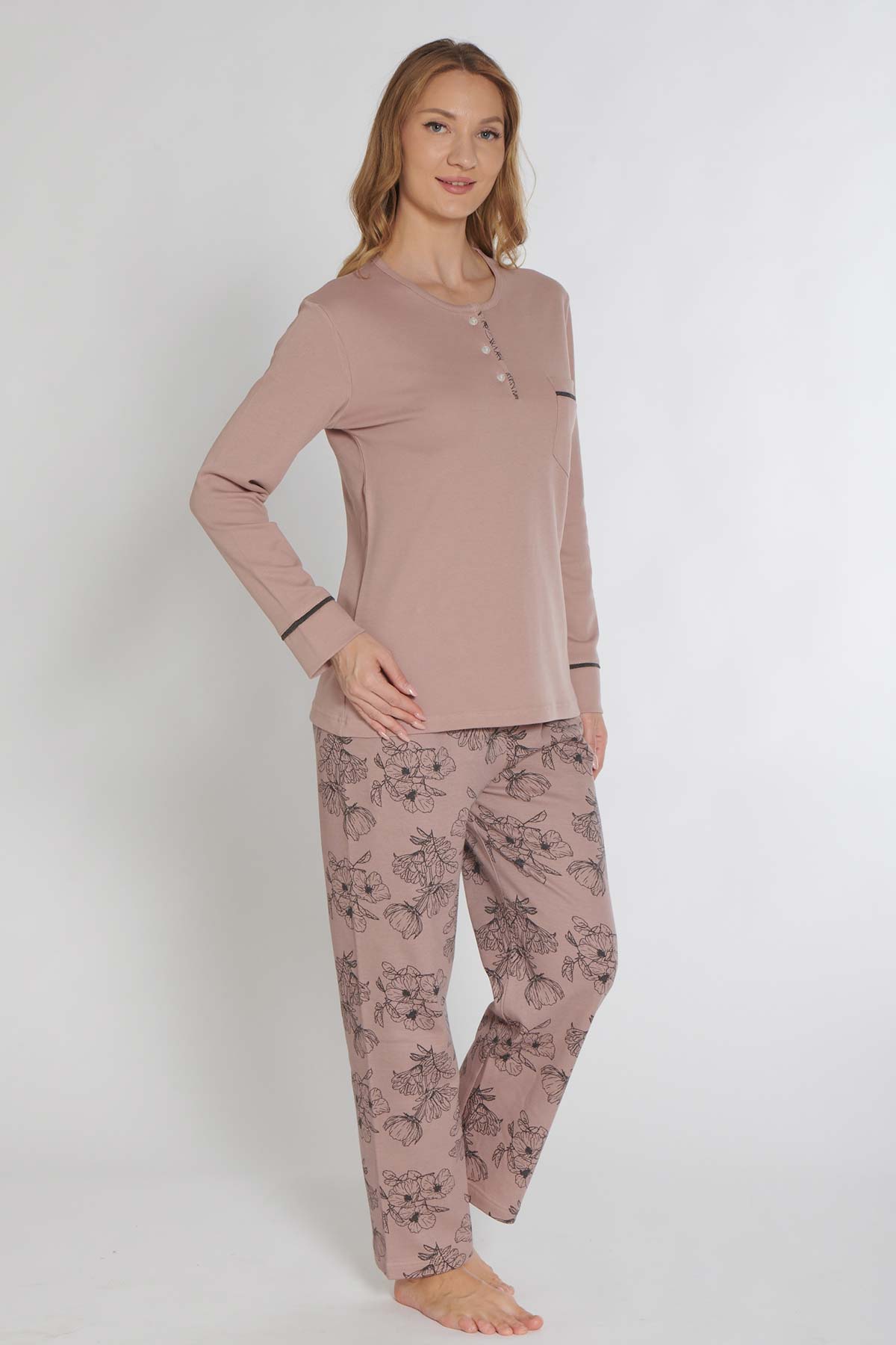 Pınarca Kadın Pijama Takımı Uzun Kollu Düğmeli İnterlok Cep Kol Biyeli - Lila