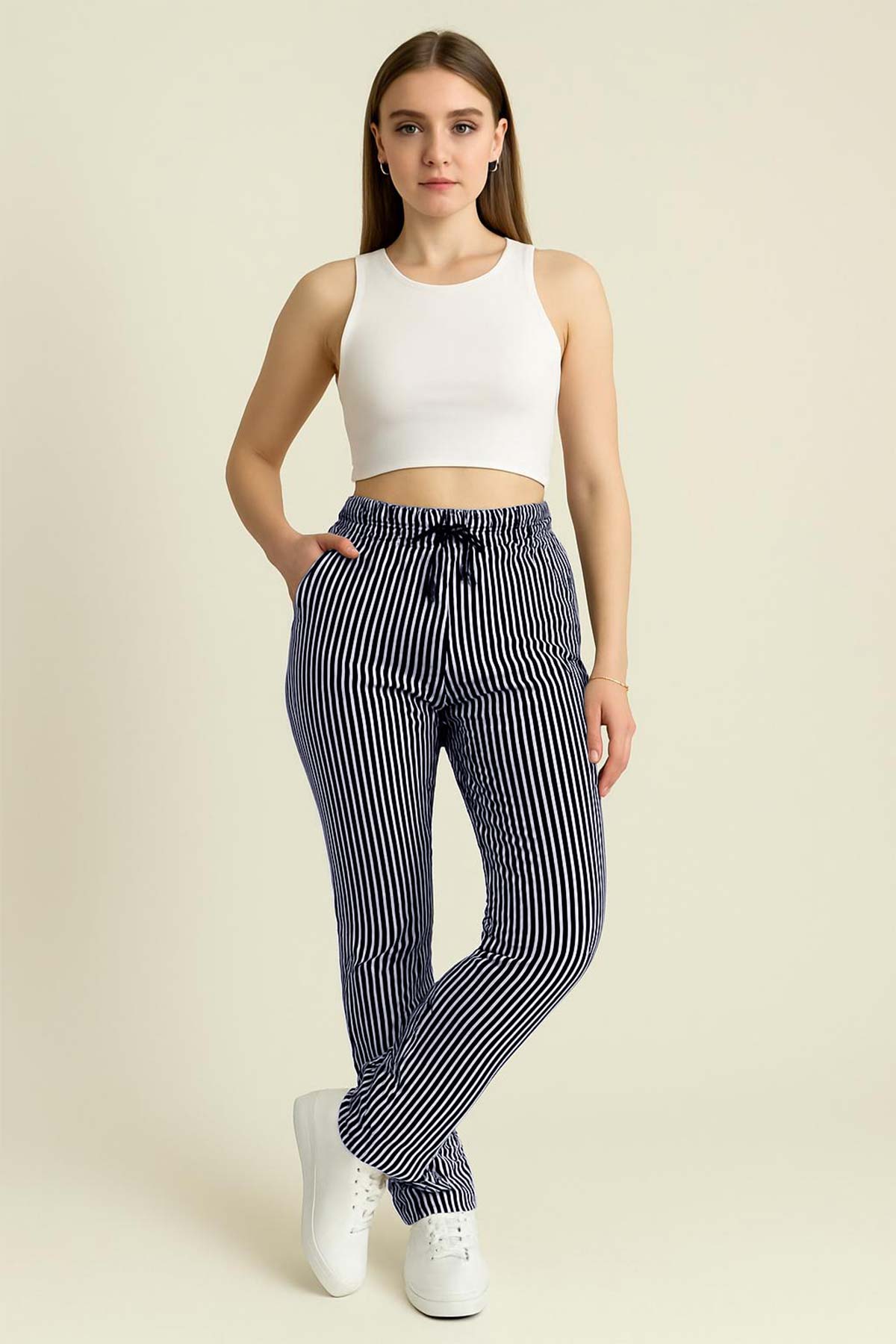 Pınarca Kadın Tek Alt Pantolon Su Yolu Pamuklu Boru Paça Cepli - Lacivert