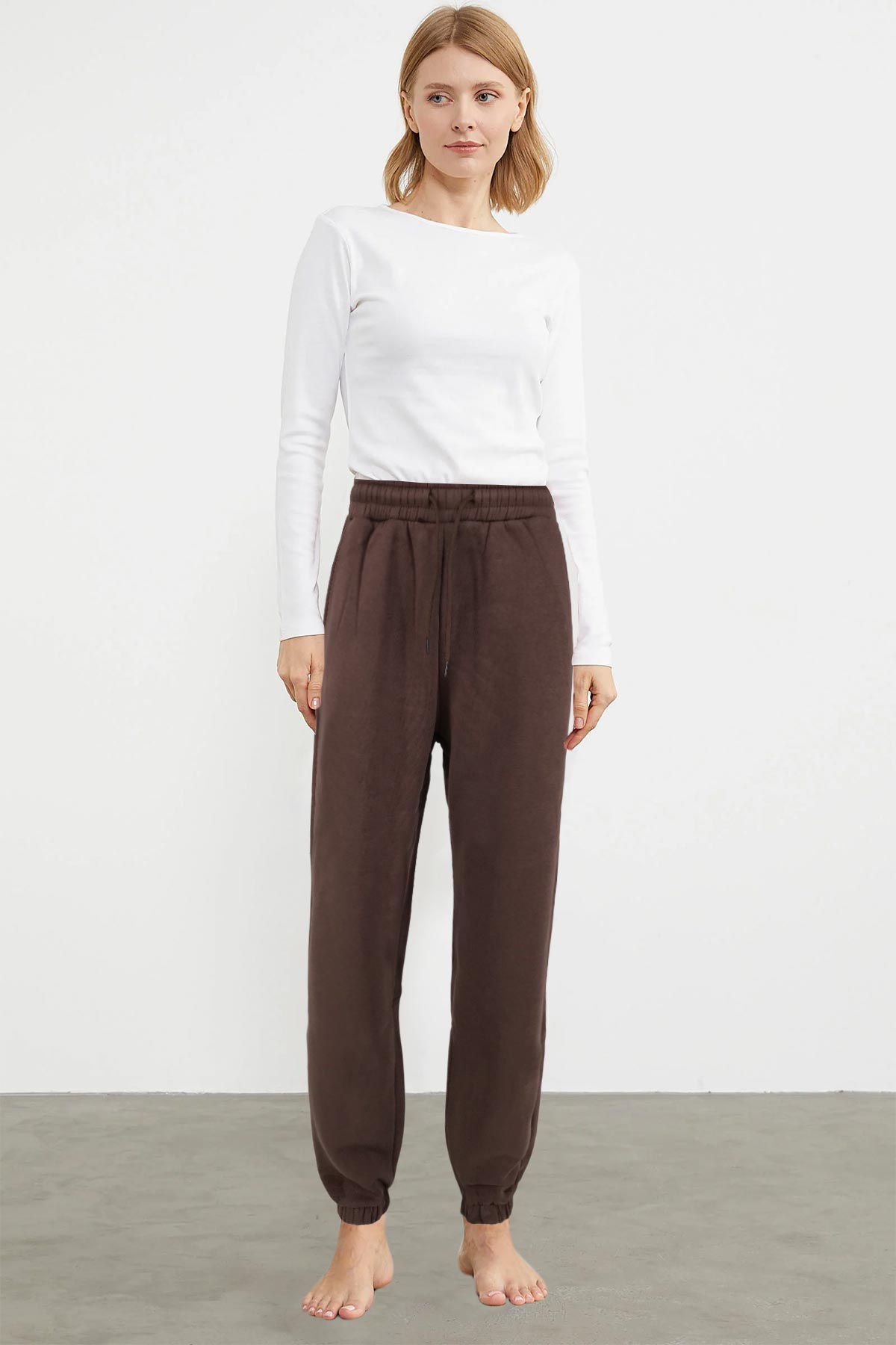 Pogi Kadın Büyük Beden Tek Alt Eşofman 3 İplik Paça Manşetli - Acı Kahve