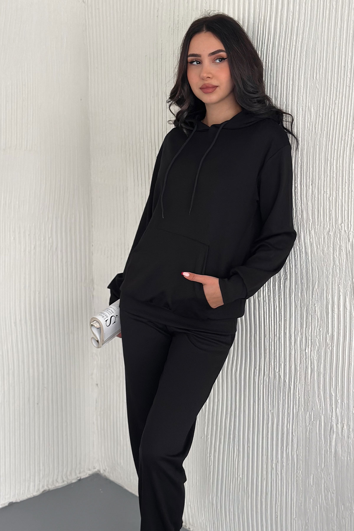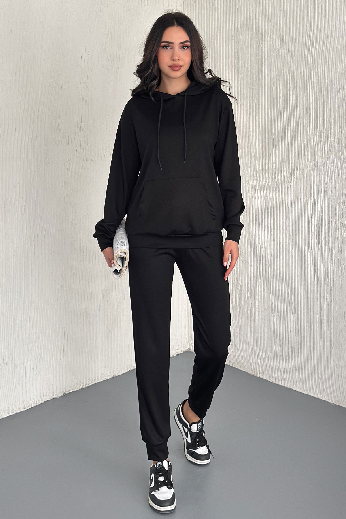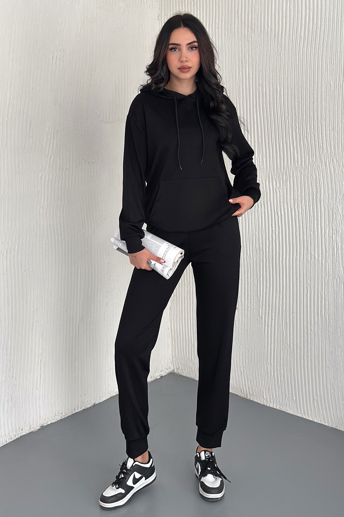 Pogi Kadın Eşofman Takımı Manşetli Paça Kapuşonlu - Siyah
