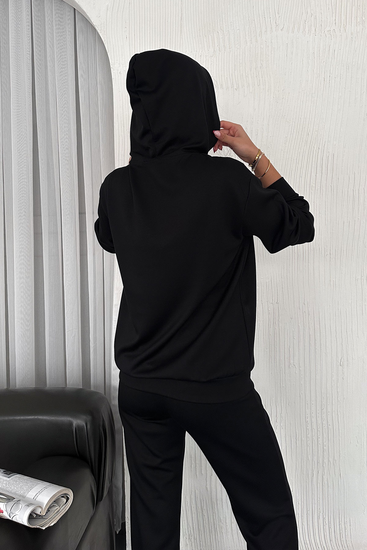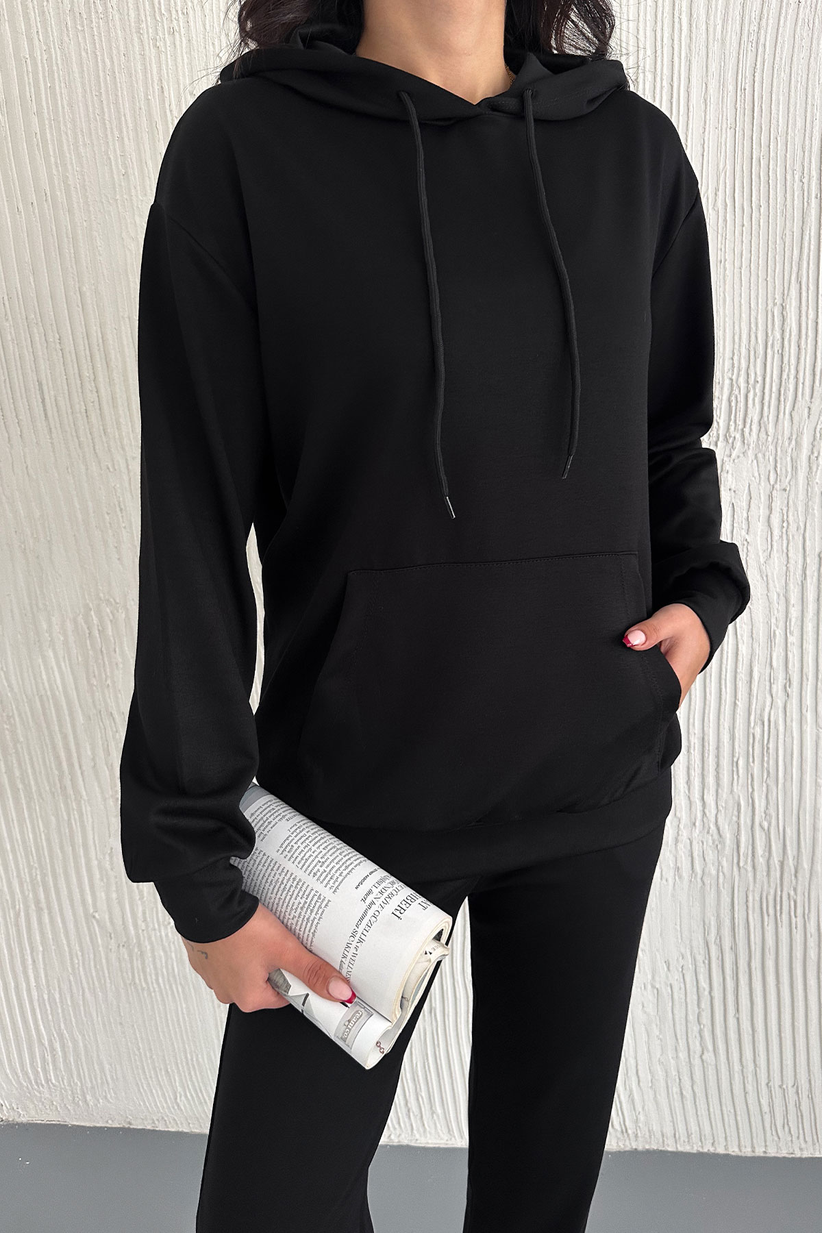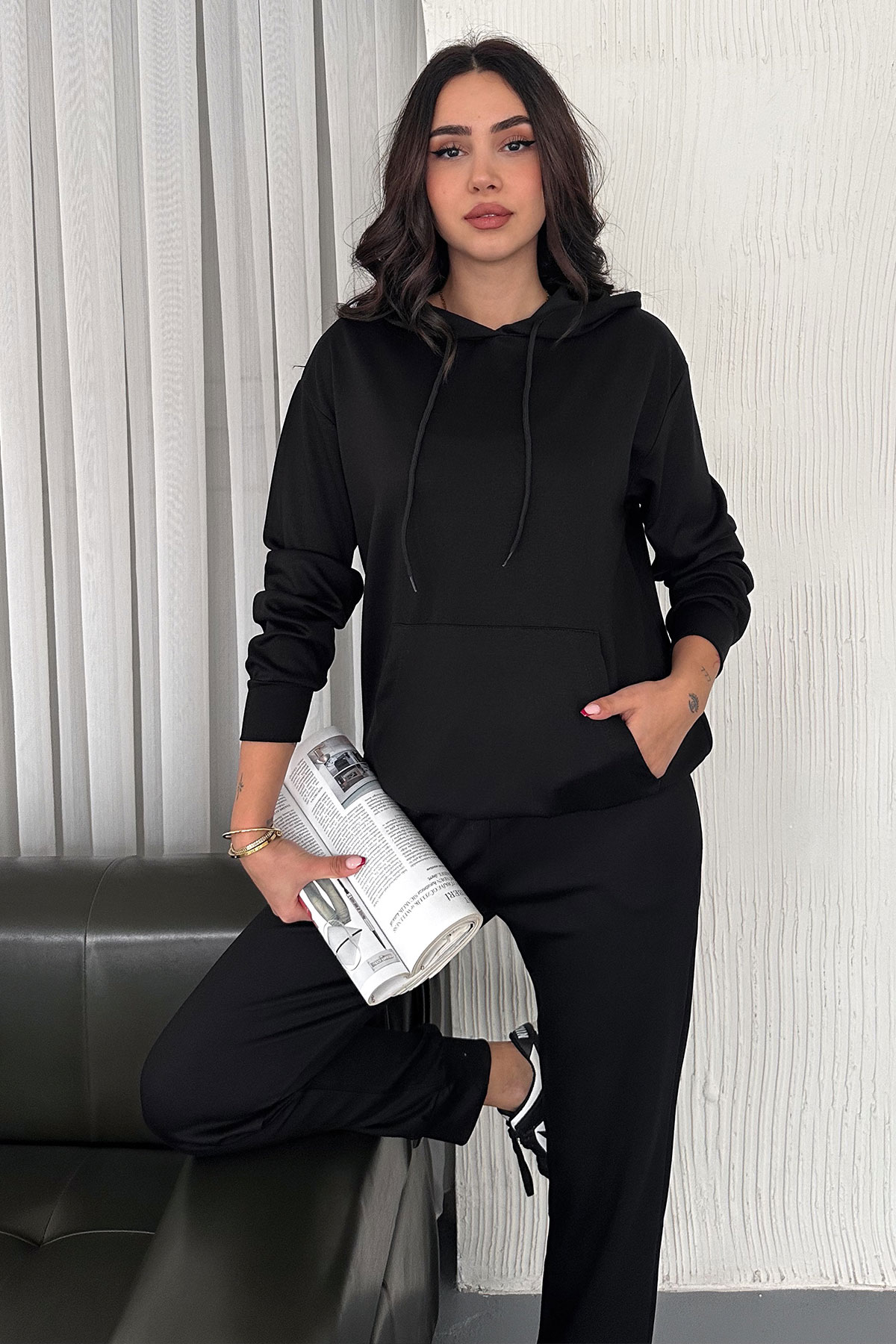 Pogi Kadın Eşofman Takımı Manşetli Paça Kapuşonlu - Siyah