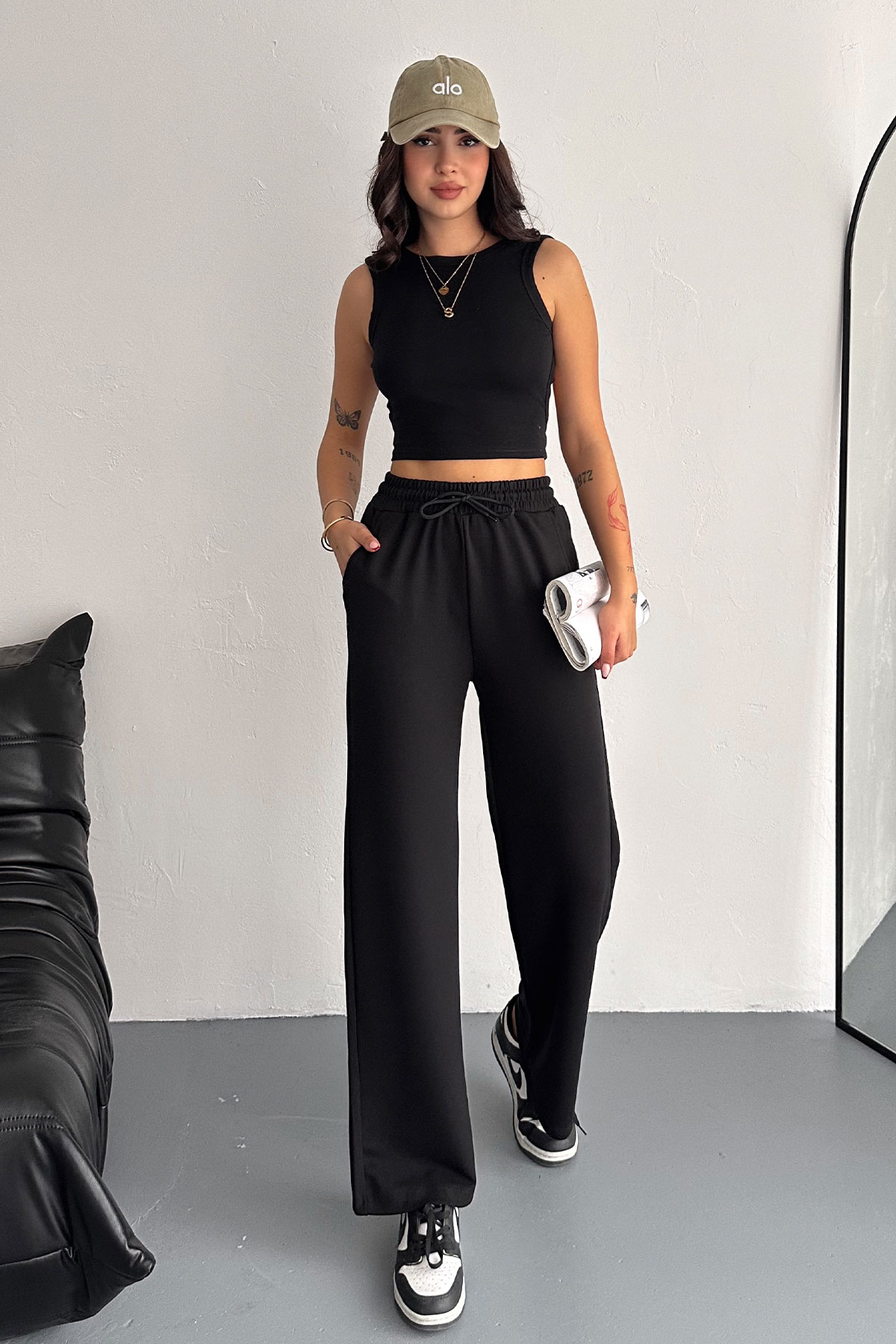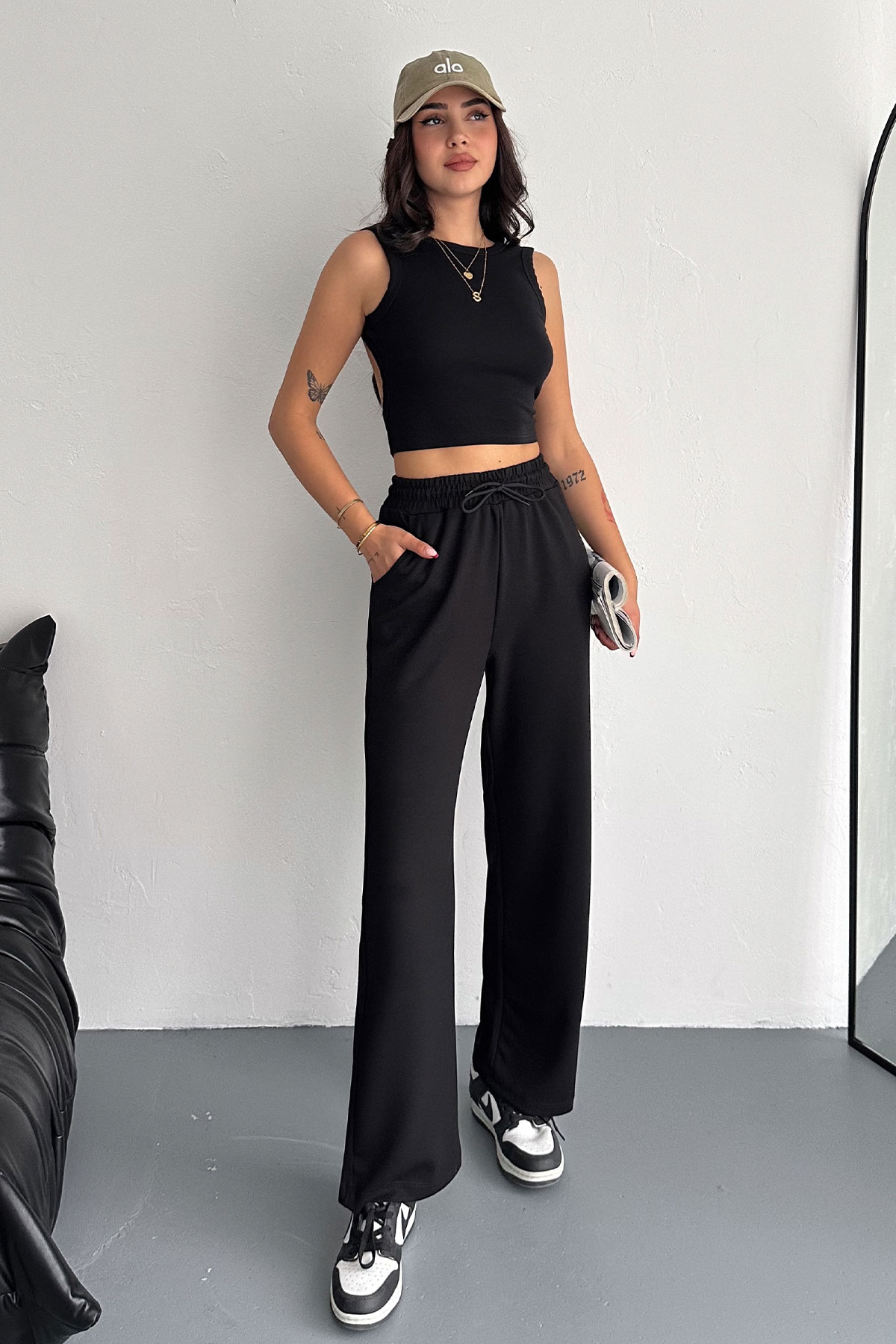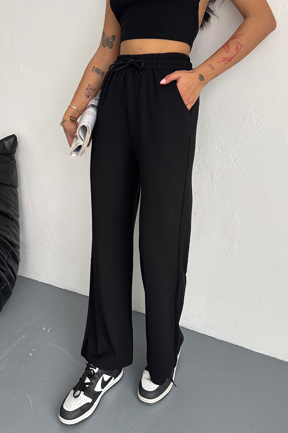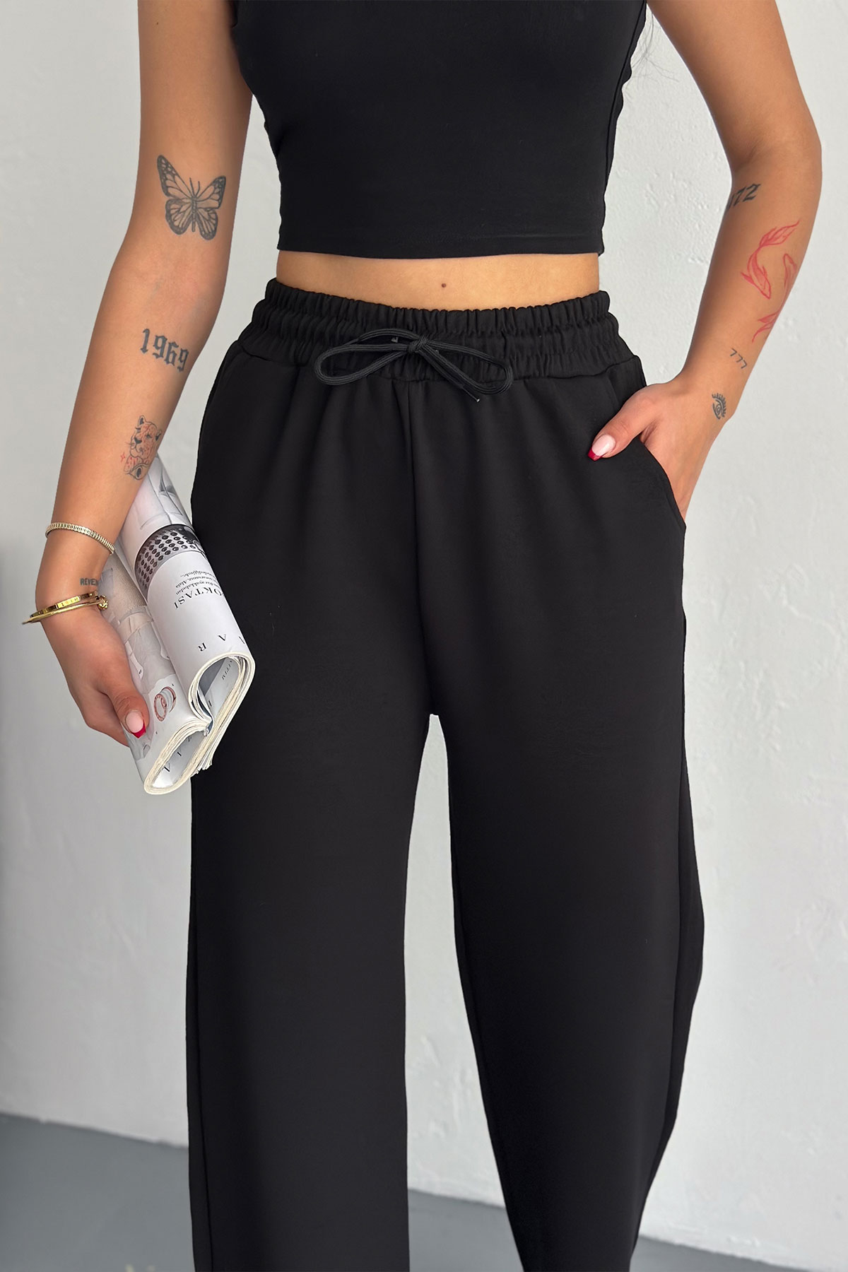 Pogi Kadın Tek Alt Eşofman Cepli Geniş Paça Modal - Siyah